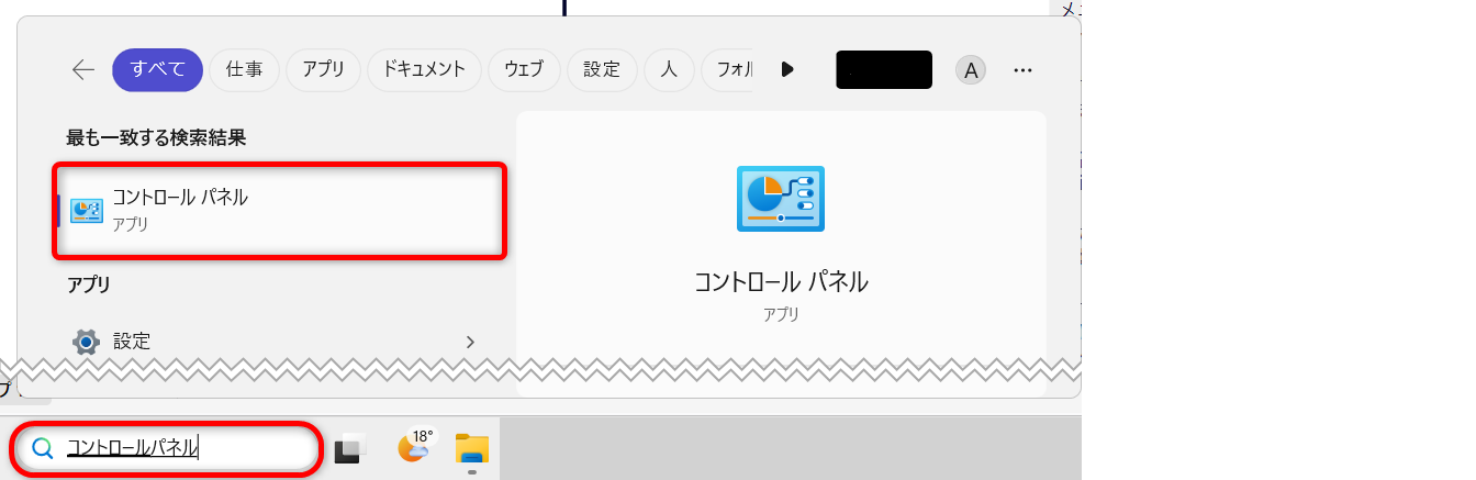 コントロールパネルを開くには、Windowsの検索に「コントロールパネル」と入力します。