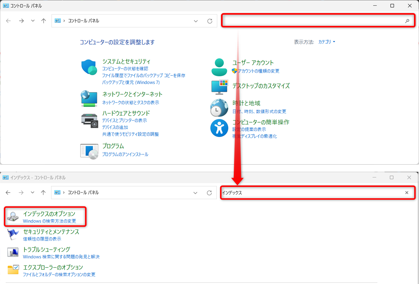 4-2.と同じ手順でコントロールパネル開き、インデックスのオプションを表示します。