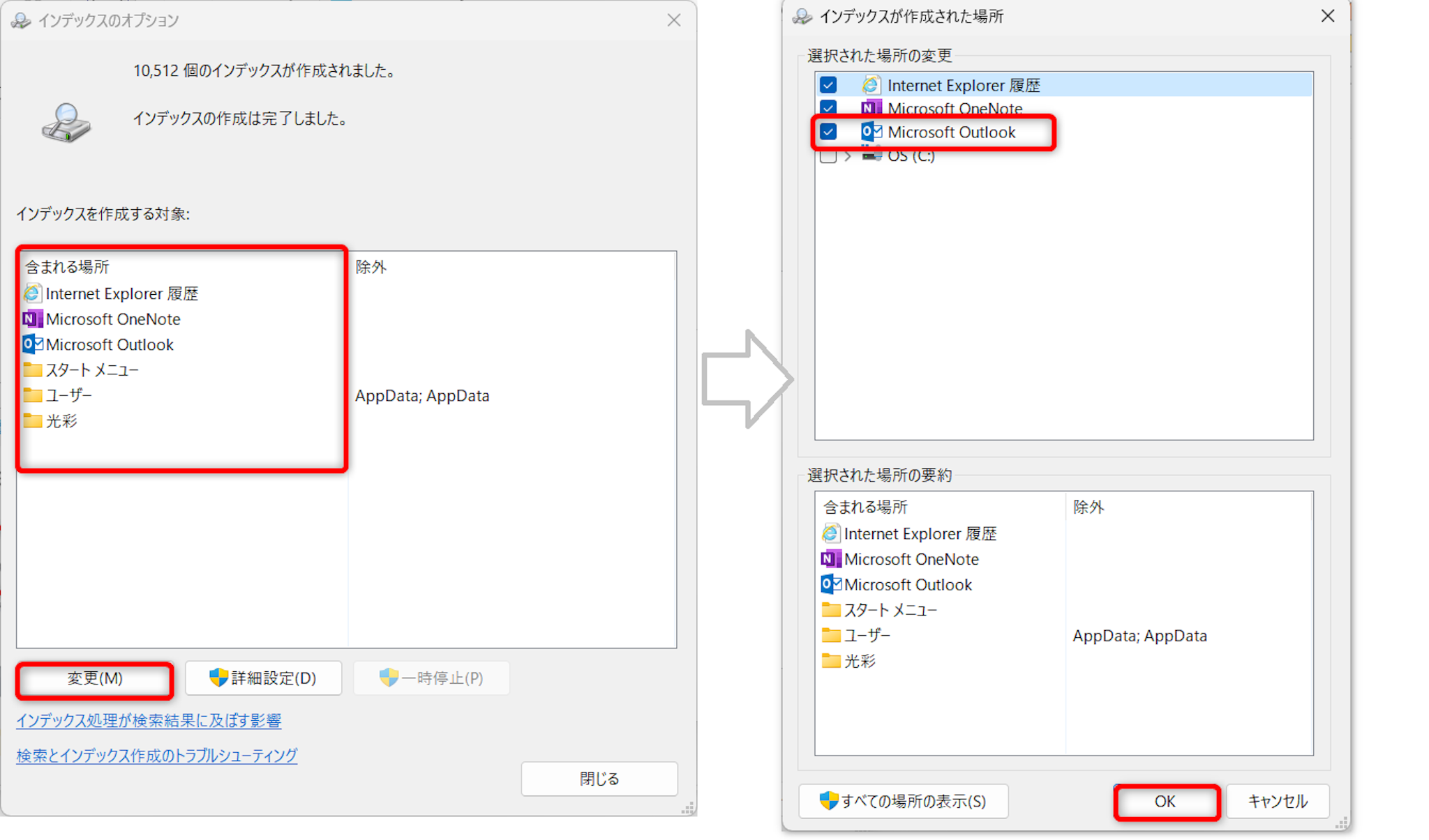 選択された場所の変更のOutlookにチェックを入れ、[OK]を押します。