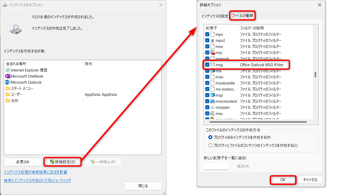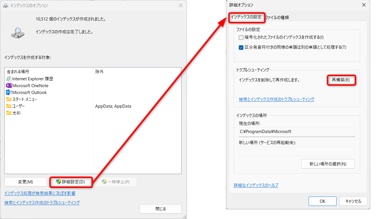 先ほどと同じ手順でコントロールパネルから、インデックスのオプションを開きます。