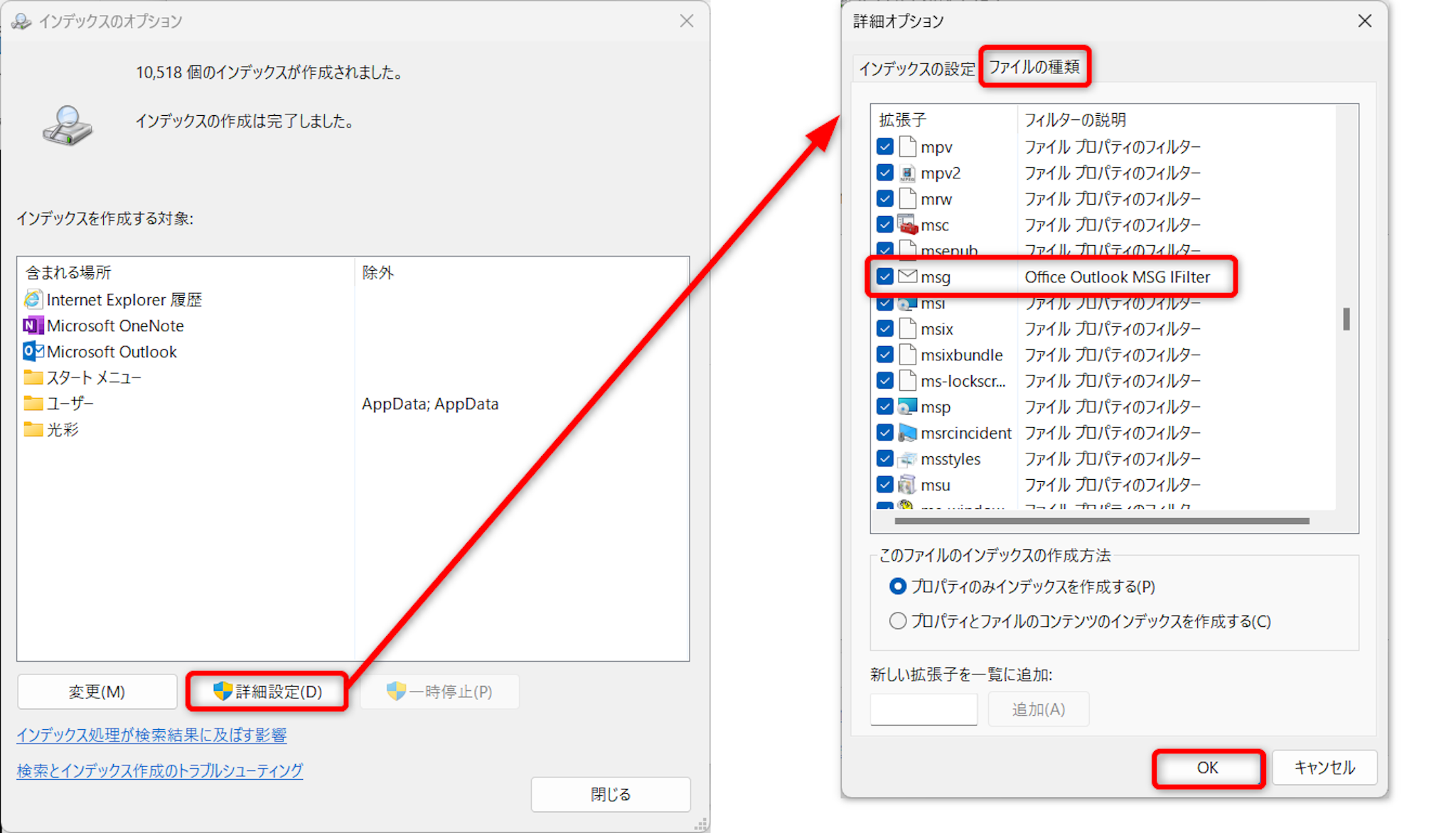 [ファイルの種類]タブを開き、スクロールして「msg」を探します。