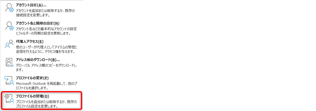 Outlookのプロファイルとは、アカウントの情報やデータファイルなどの情報が入っているファイルです。