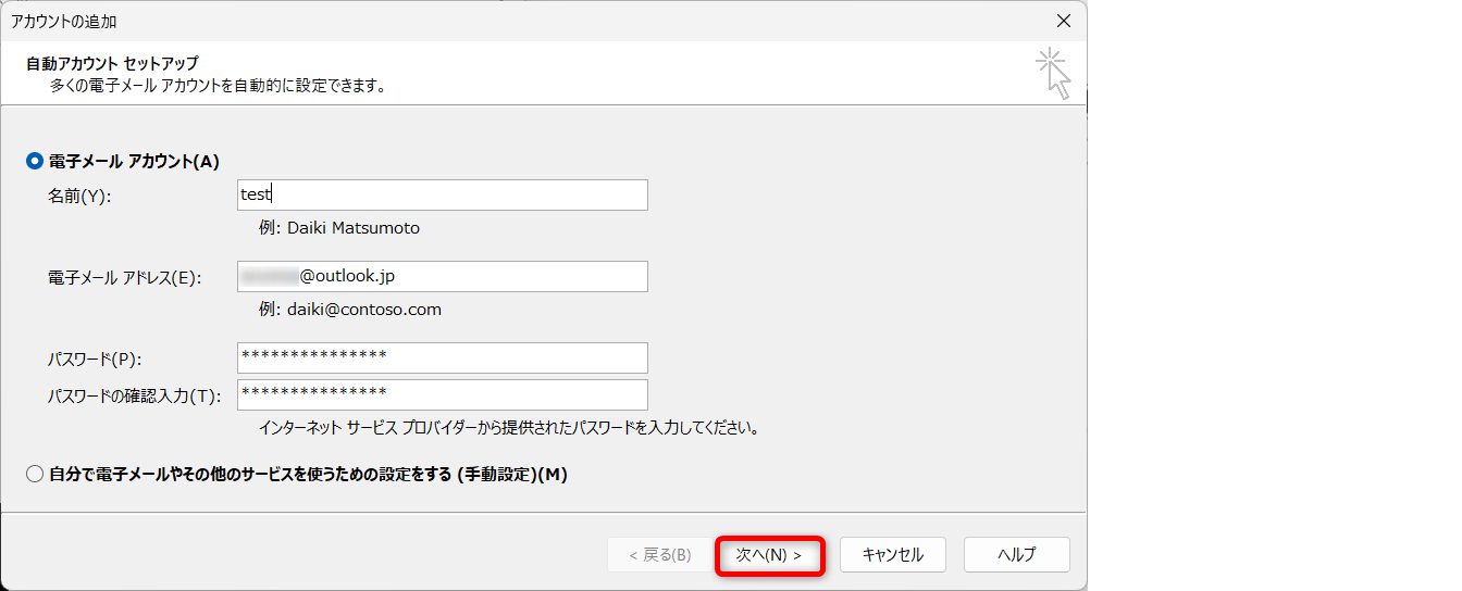 名前、Outlookに使用するアカウント、そのアカウントのパスワードを入力し、[次へ]をクリックします。