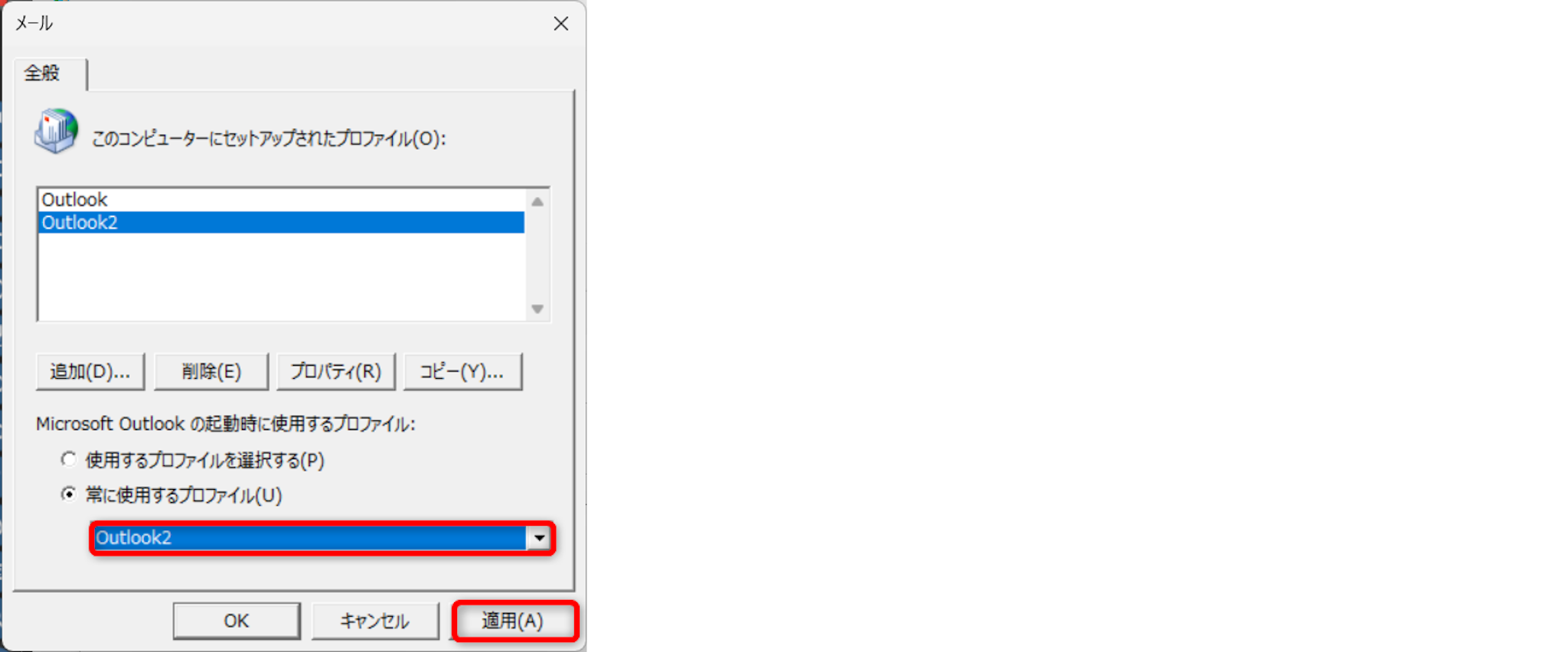 常に使用するファイルを先ほど作成したプロファイルに変更し、[適用]をクリックします。