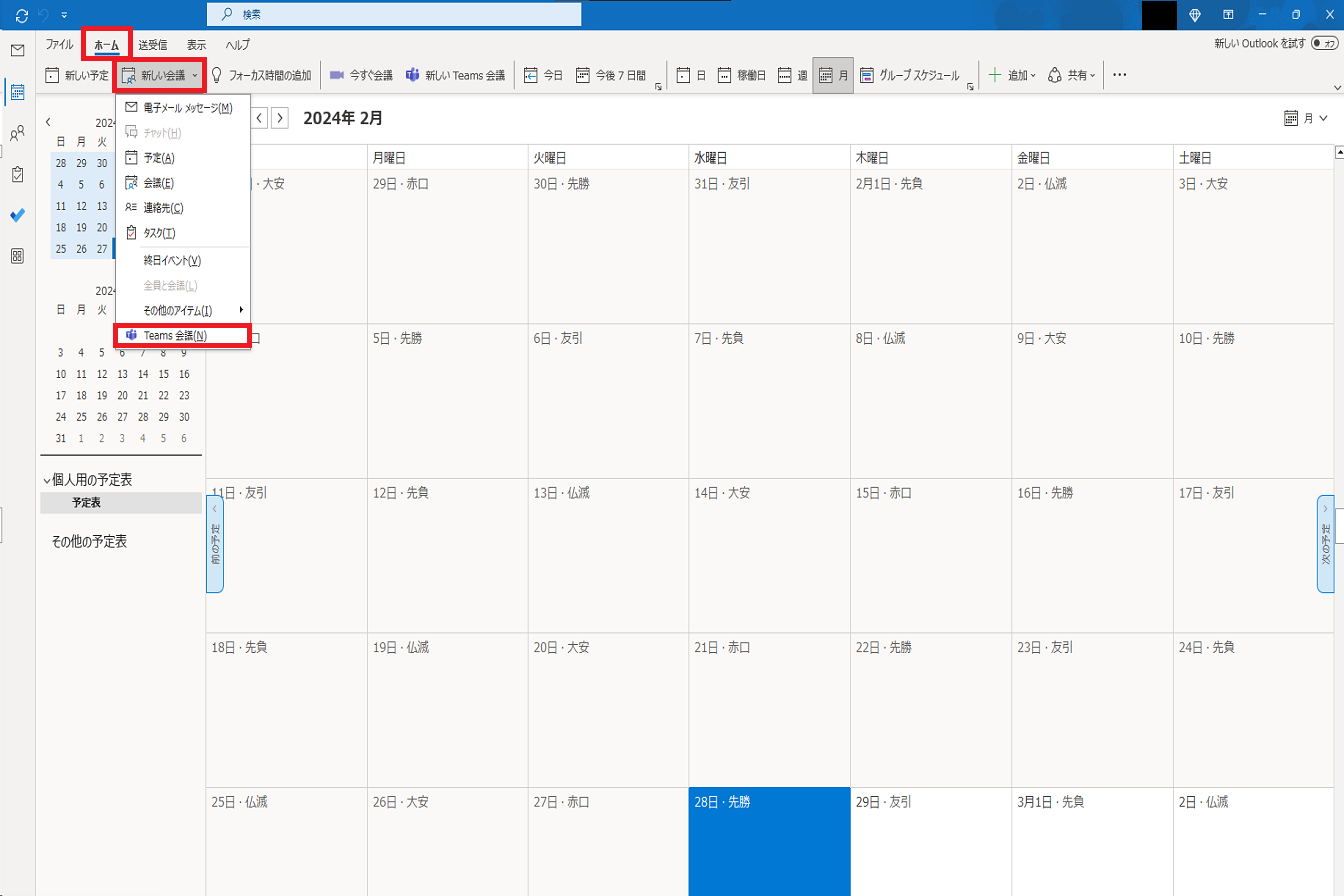 ページ上部にある「ホーム」のタブから、「Teams会議」を選択します。(※新しいOutlookの場合は、予定作成画面の上部にある「Teams会議」のトグルスイッチをオンにします)