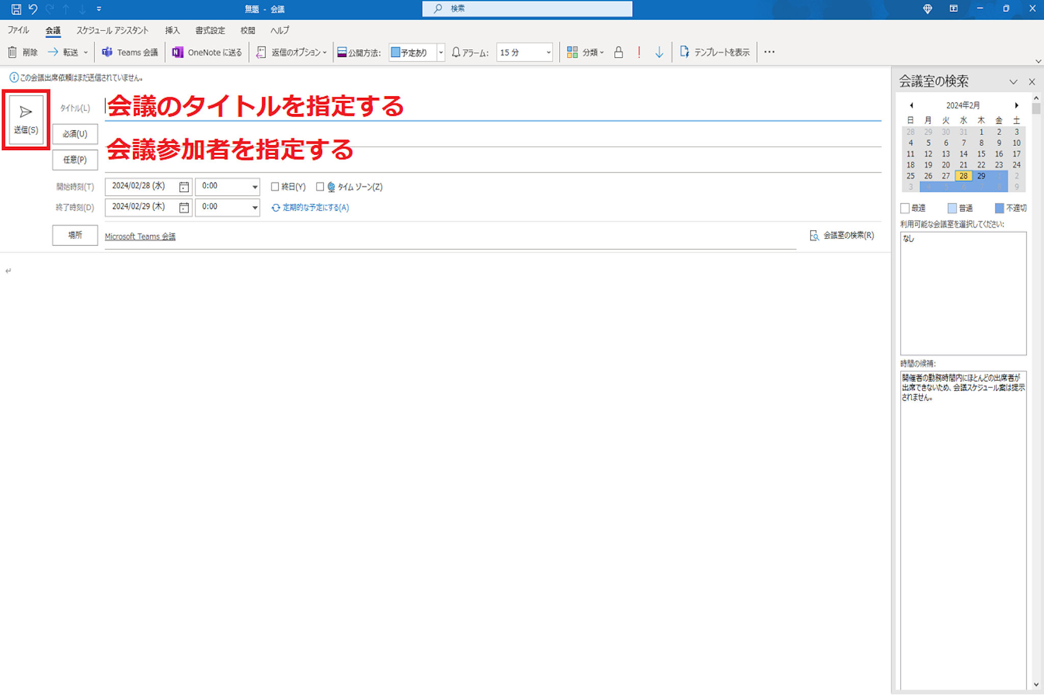 先の方法では、OutlookからTeams会議を作成すると同時に、会議参加者となるユーザーを招待して、そのユーザーのTeamsにも会議予定を追加することができました。