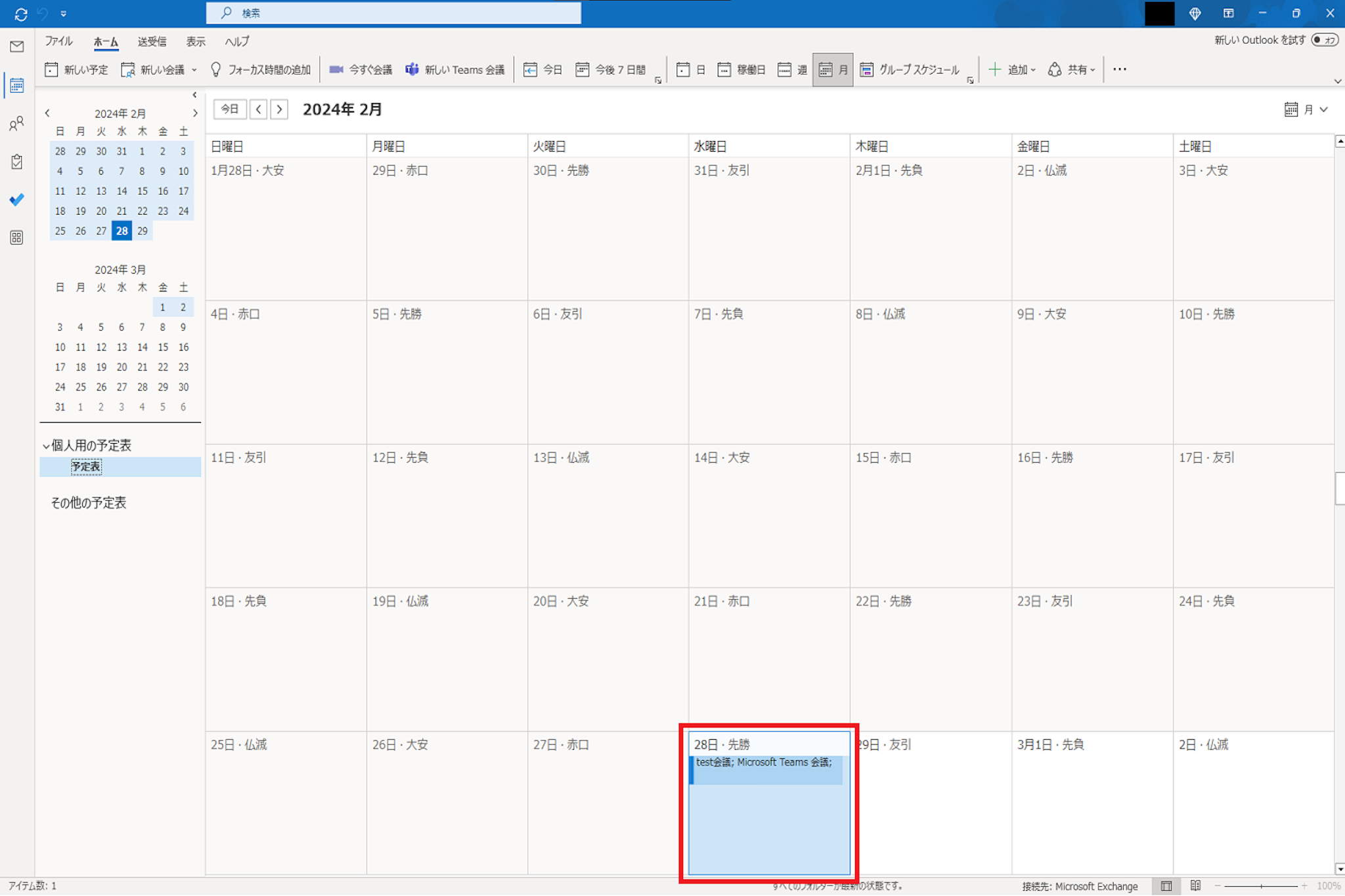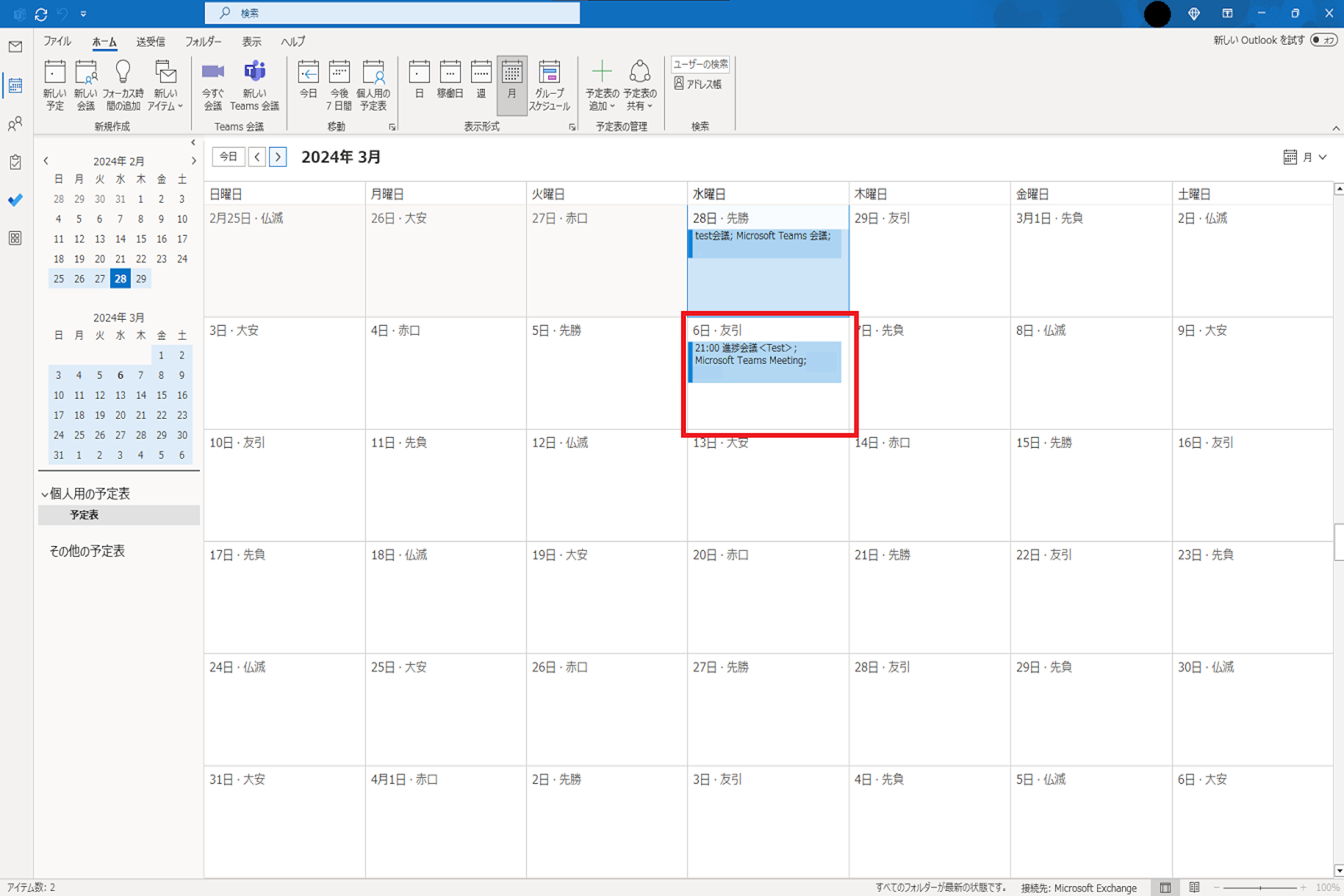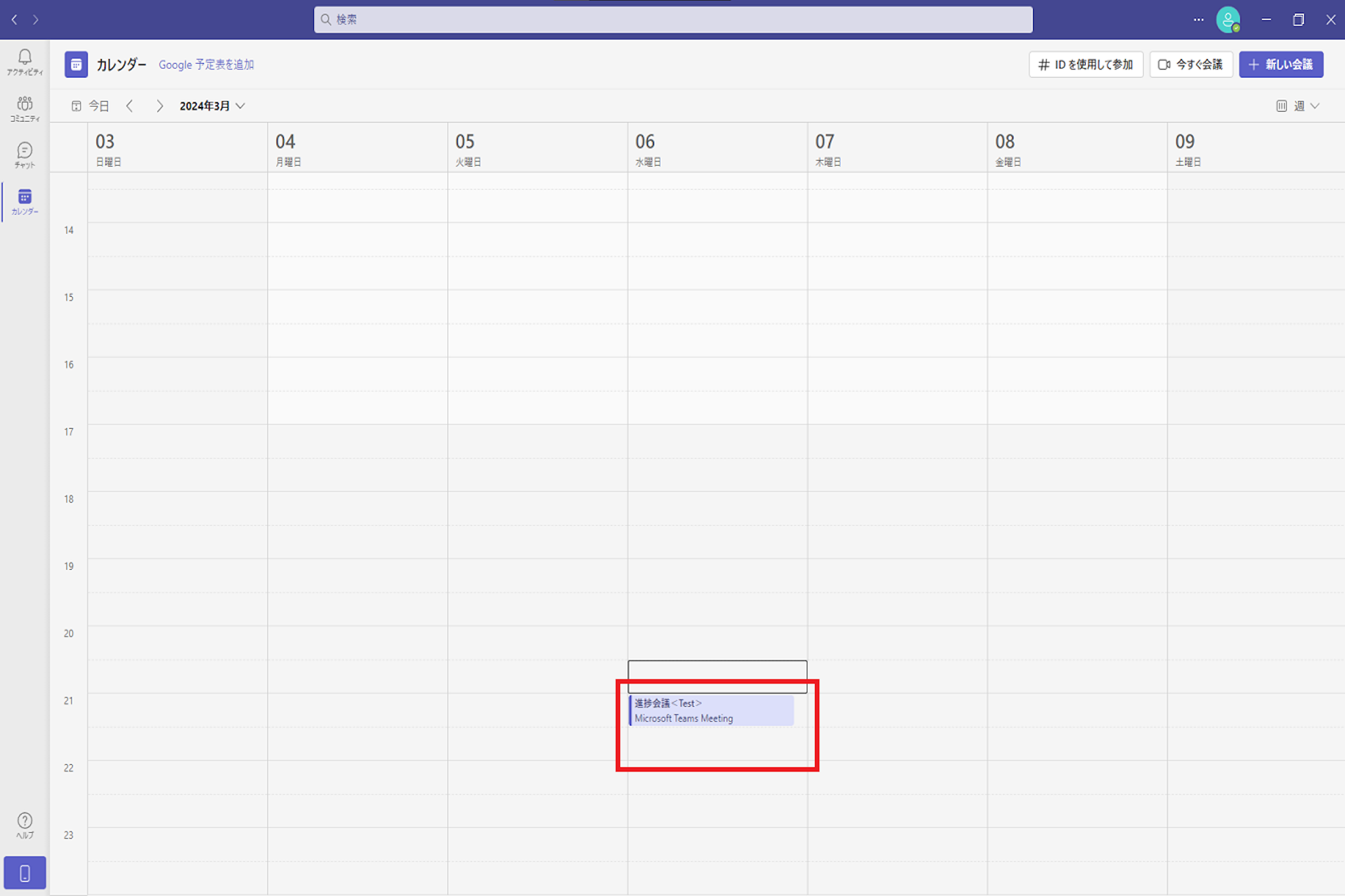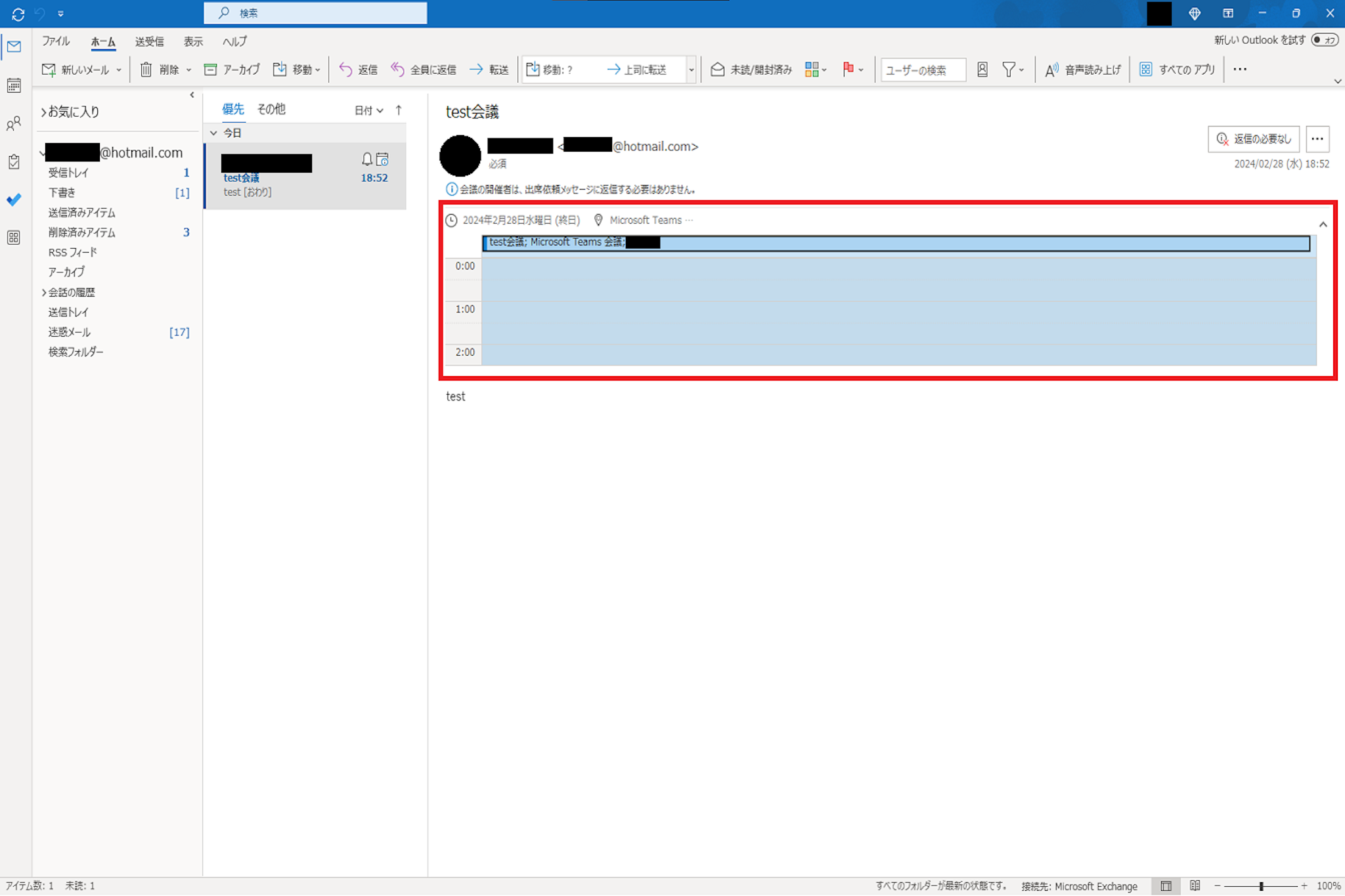 入力が完了して「送信」をクリックすると、招待されたユーザーの予定表画面に、Teams会議の参加リンク付きの予定が追加されていることがわかります。