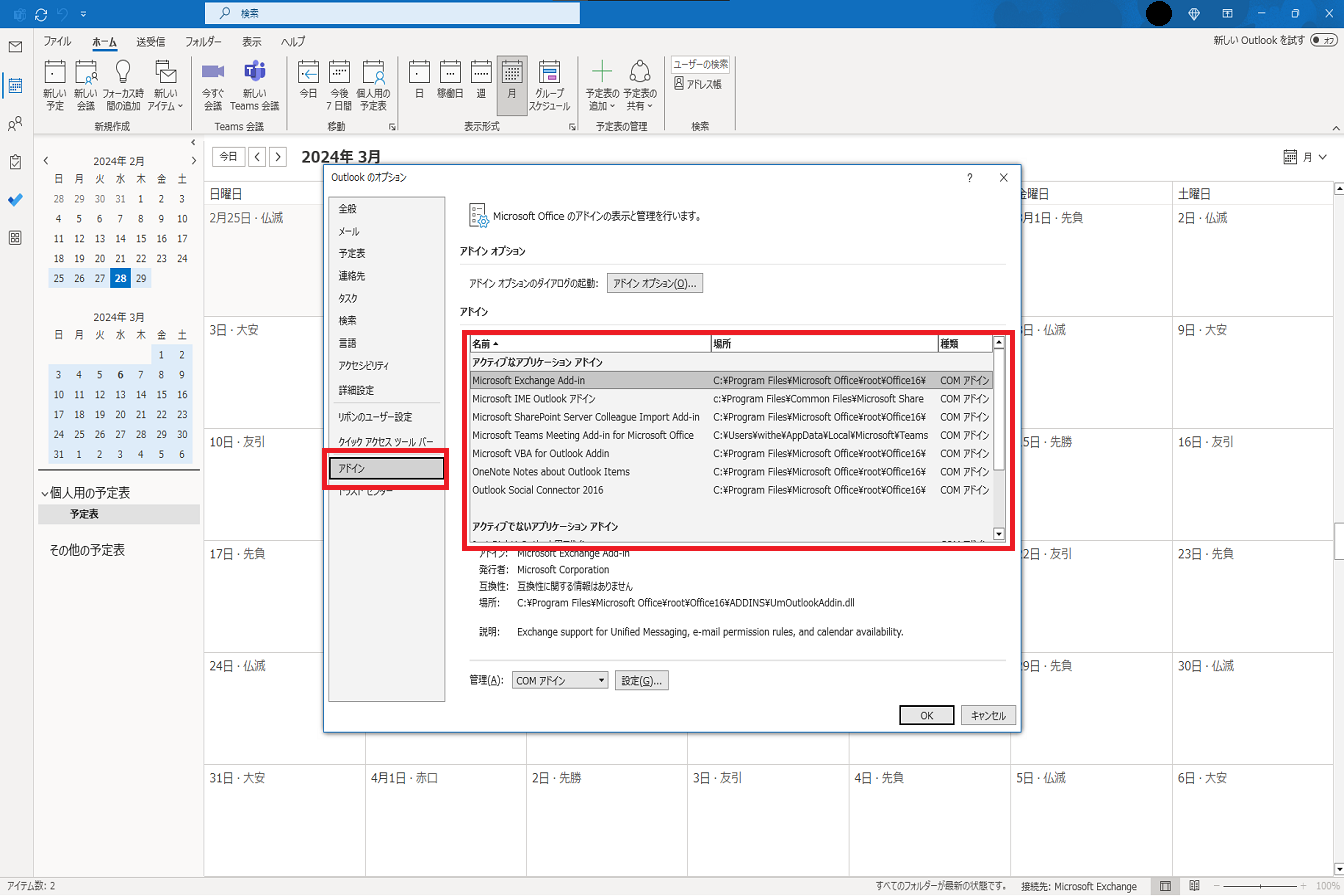 「従来のOutlook」を使用している場合、何らかの理由でTeams連携用のCOMアドインが停止、または無効となってしまうケースがあります。