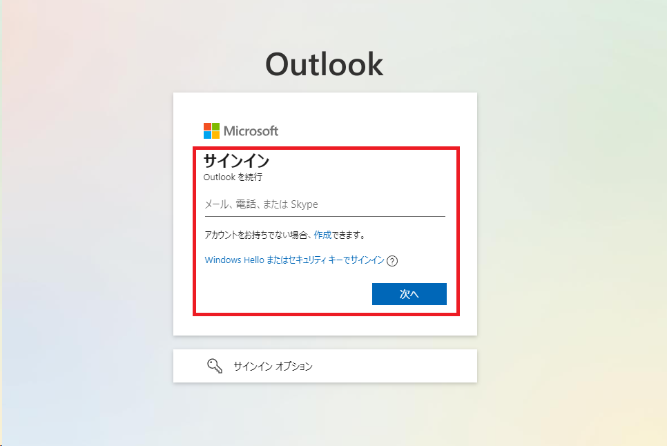 OutlookのWeb版のページを開くことができたら、「サインイン」のボタンをクリックします。