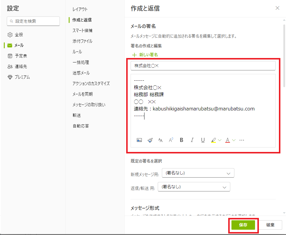そうすると、メールの署名を作成する画面に移るため、ここで署名の名前と内容を登録し、「保存」のボタンをクリックします。