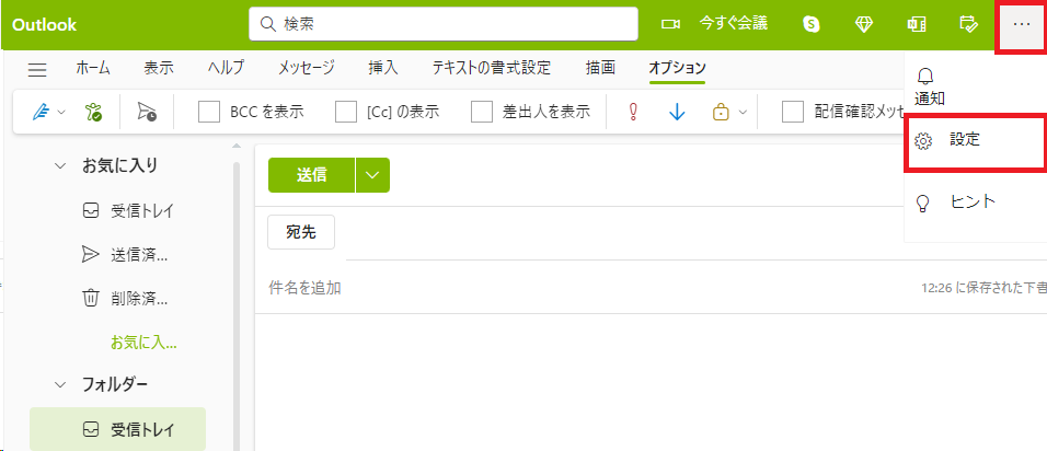 この通知の設定は、Outlookの受信トレイの画面の右上にある、「・・・」の設定メニューから設定します。