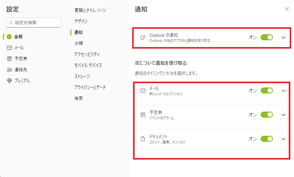 「全般」「通知」の設定メニューに進むと、Outlookからの通知についての設定をオンにするか、また、メール、予定表、ドキュメントへのコメントやメンションなど、それぞれの通知について表示するか否かを選択することができます。