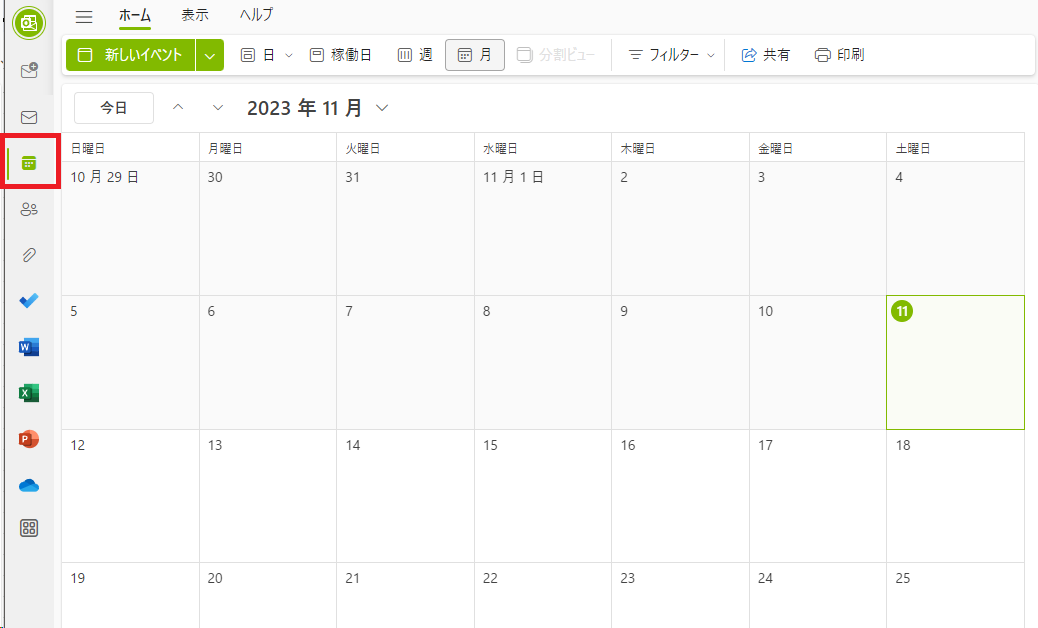 予定表機能にアクセスするには、Outlookの画面の左側に縦に並んだアイコンの一覧から、カレンダーのアイコンをクリックします。