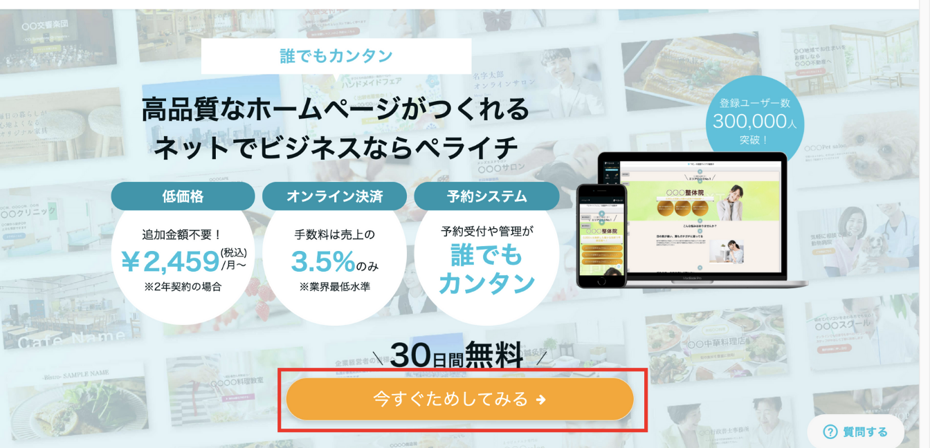 ペライチのサイトにアクセスしたら、「今すぐためしてみる」をクリックします。