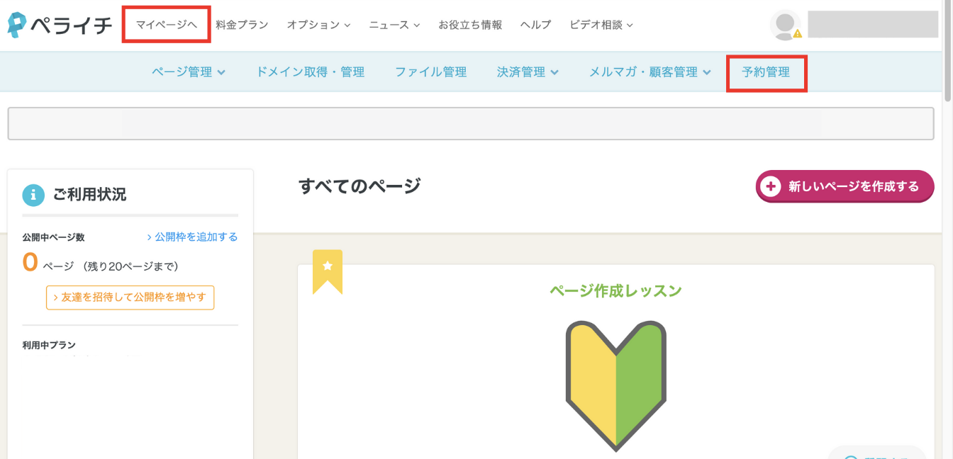 ペライチのサイトで「マイページ」をクリックします。マイページの上部の「予約管理」をクリックします。