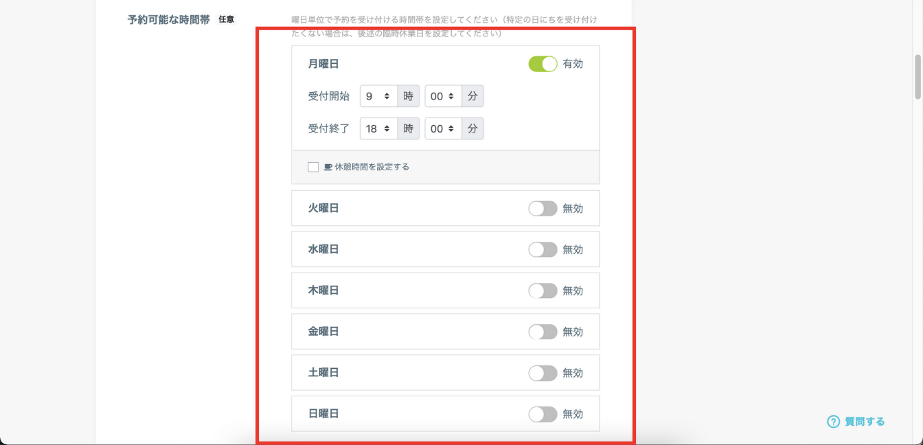 予約できる曜日を設定します。この画像場合、月曜日だけが予約できる状態です。