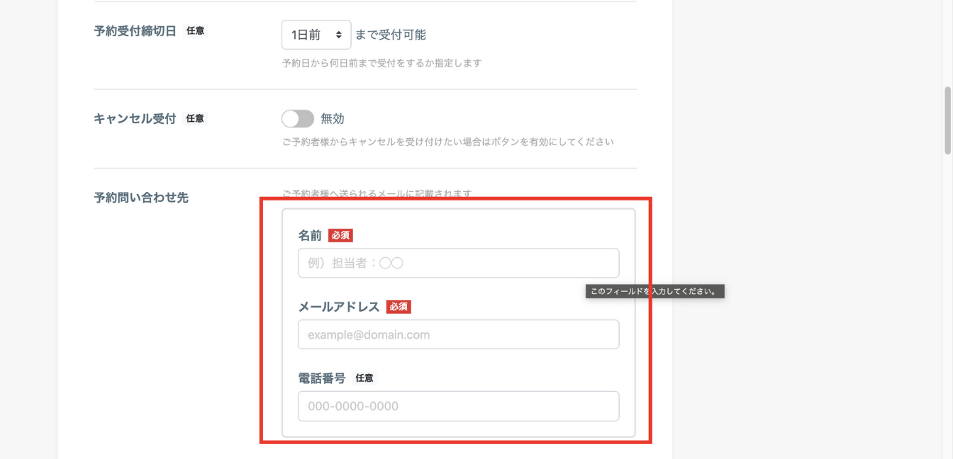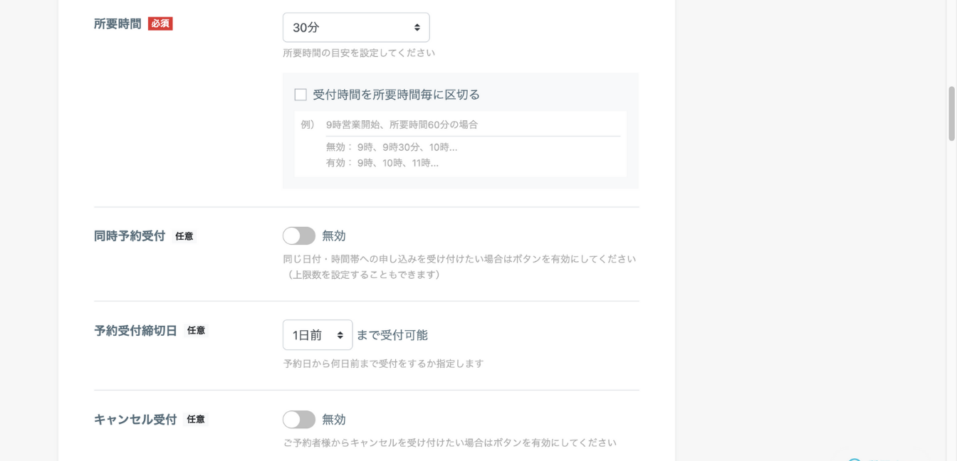 予約枠の時間、同時予約(同時に何人まで予約できるのか)、予約の締め切り日、キャンセル受付の可否を設定します。