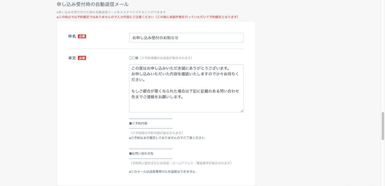 申し込みを受け付けたときに、予約した人に送られるメッセージを設定します。