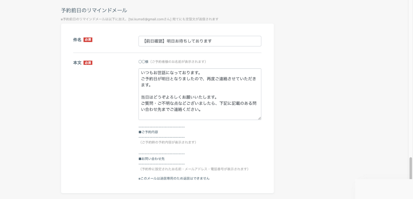 予約前日のリマインドメールのメッセージを設定します。