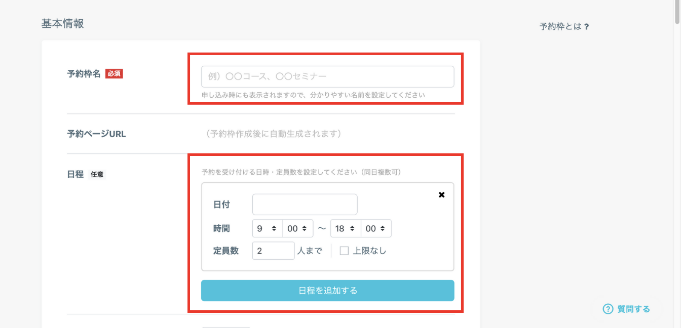 予約枠名とイベント等の開催日時を設定します。