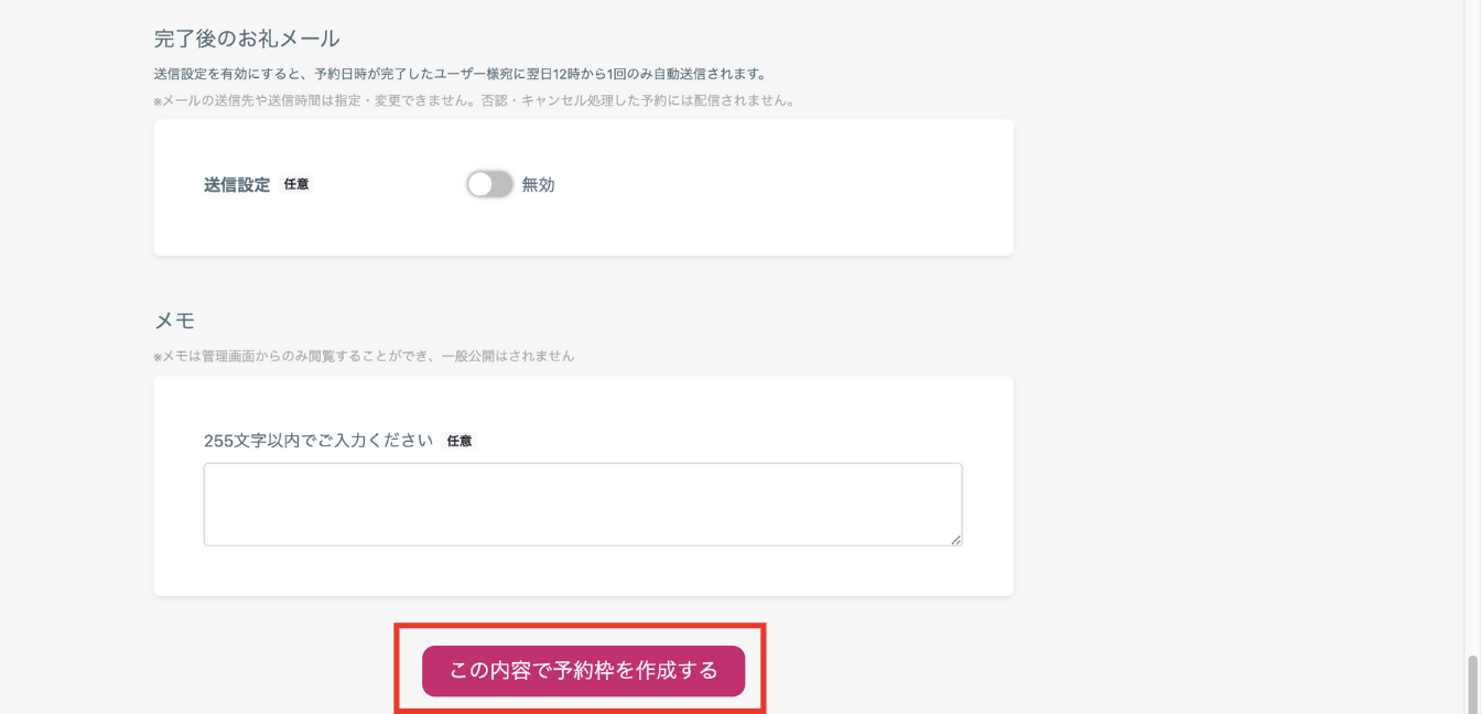 最下部までスクロールし、「この内容で予約枠を作成する」をクリックすると、予約の完成です。