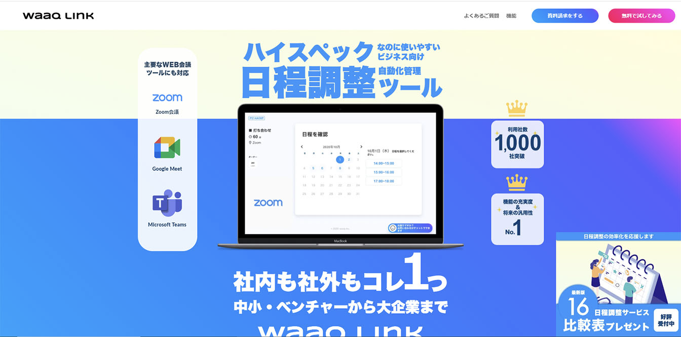 waaq Linkは利用社数1,000社を突破している実績を持つ日程調整ツールです。