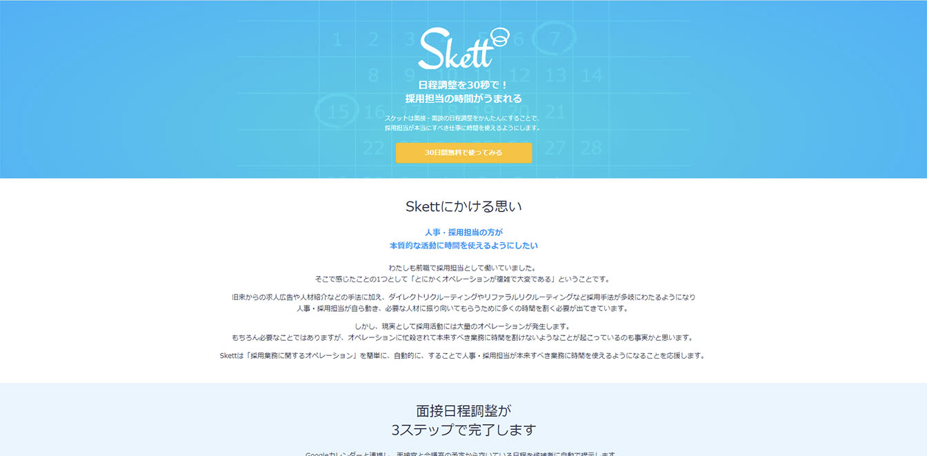 Skettは採用業務に関するオペレーションを簡単かつ自動的し、採用担当が本来すべき業務に時間を割けるよう支援する日程調整ツールです。