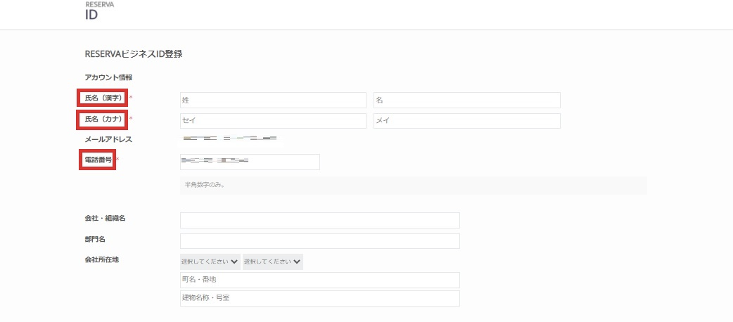 担当者の情報を入力していきます。赤枠の部分は入力必須項目です。