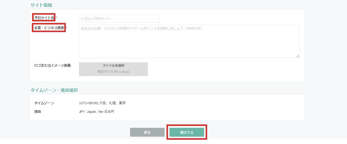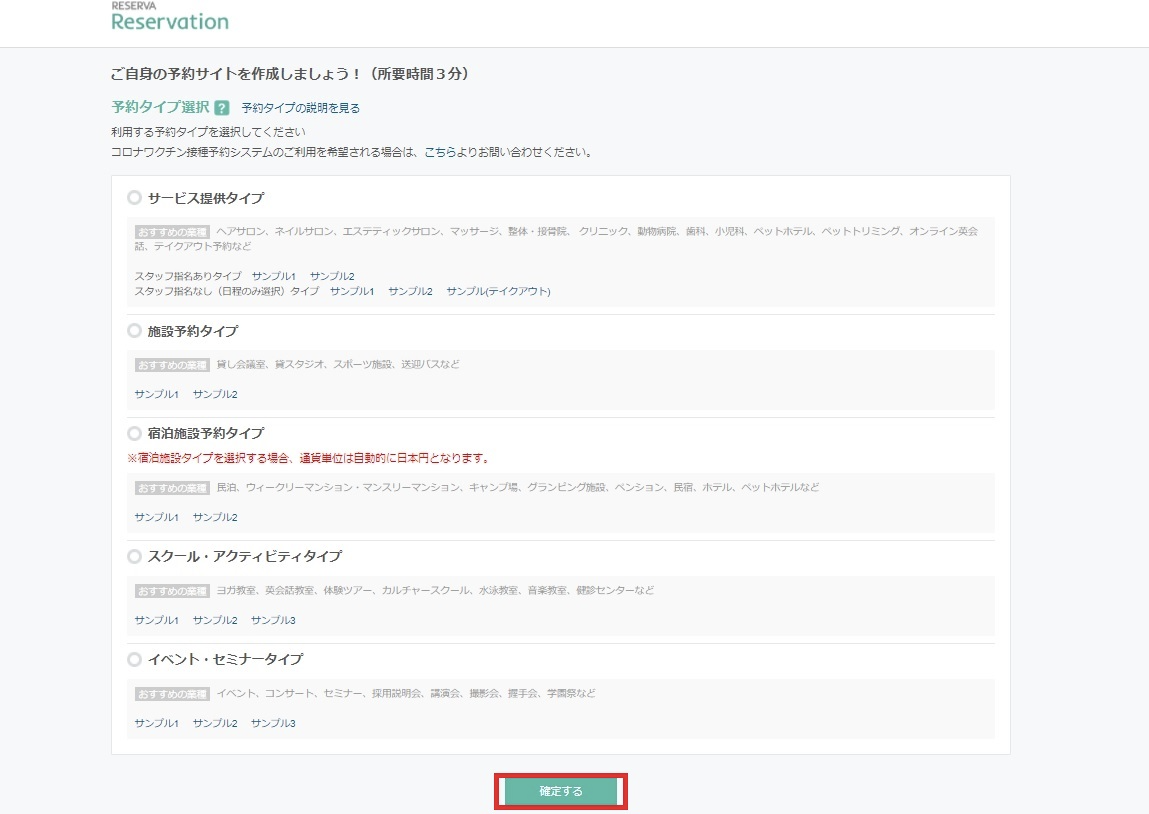 いくつかの予約タイプが用意されていますので、ご自身の事業・業種に合ったタイプを選び、「確定」をクリックします。