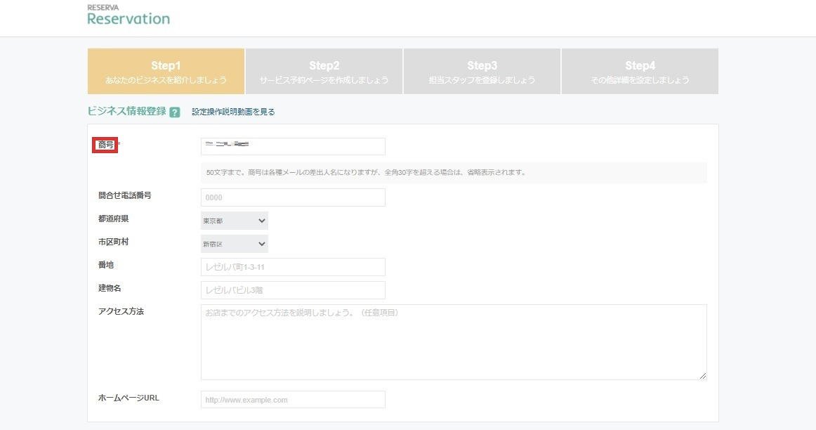 続いてビジネス情報登録へ移ります。赤枠の部分は入力必須項目です。