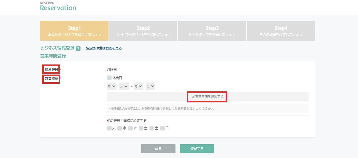 営業時間登録では、曜日ごとに営業時間や休業日の設定をしていきます。