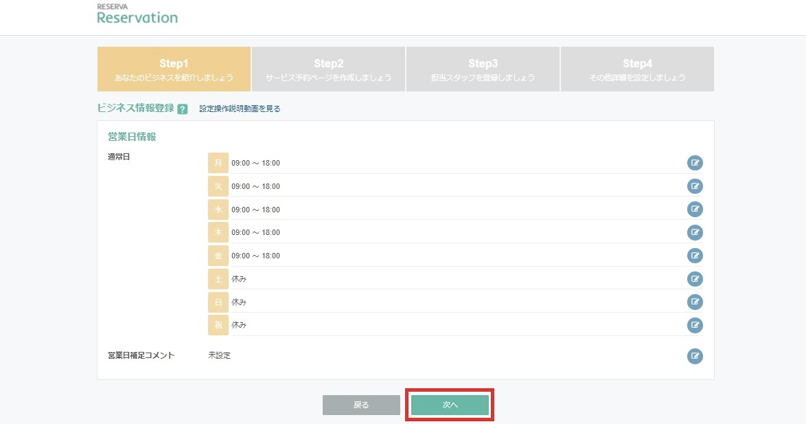 営業日の設定が完了したら「次へ」をクリックしましょう。