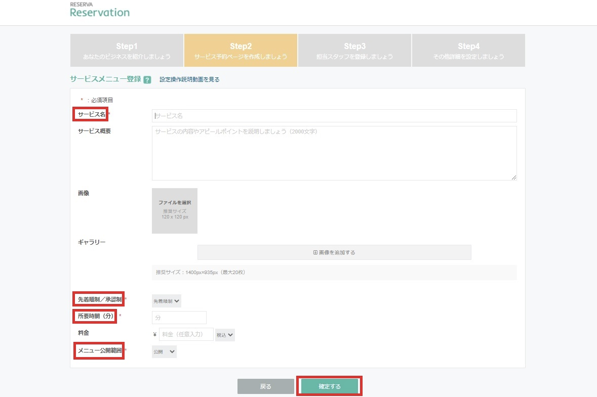 サービス内容を登録していきます。赤枠の部分は入力必須項目です。