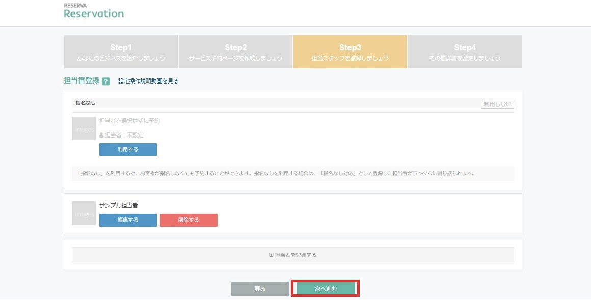 担当者登録が全て完了したら「次へ進む」をクリックしましょう。
