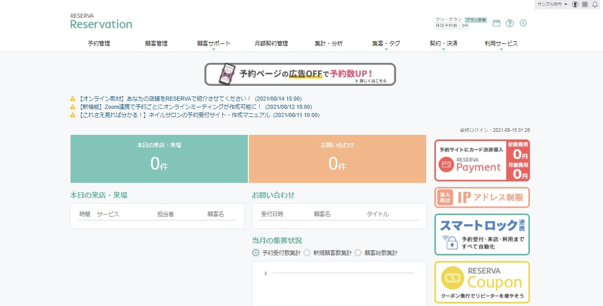 RESERVAには月額利用料が無料のまま利用できる「フリープラン」が用意されてます。