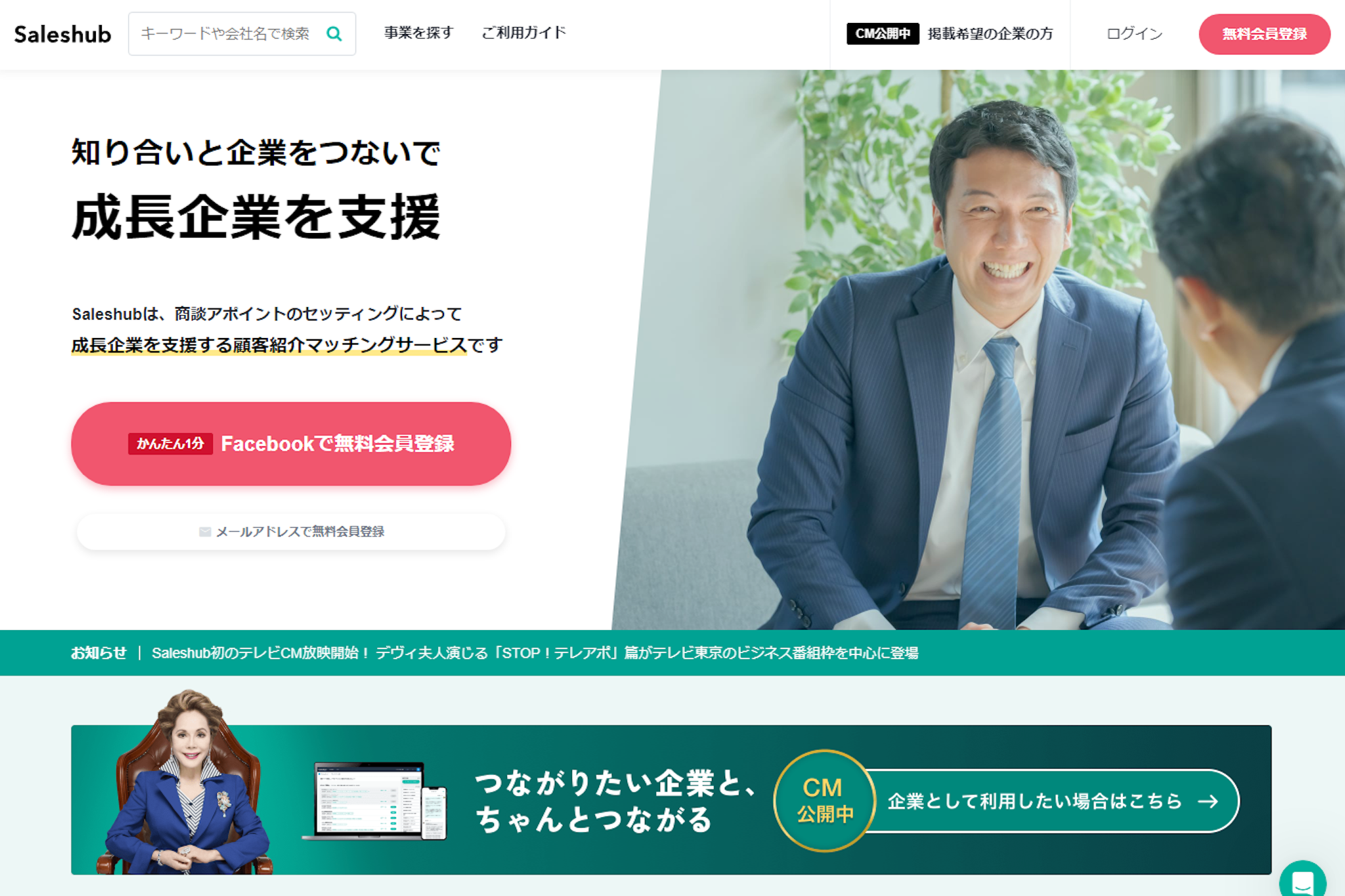 Saleshub社が提供する営業活動支援ツールです。営業担当者と企業をつなぎ、商談機会を増やすことで、企業の成長を支援することを目的としています。