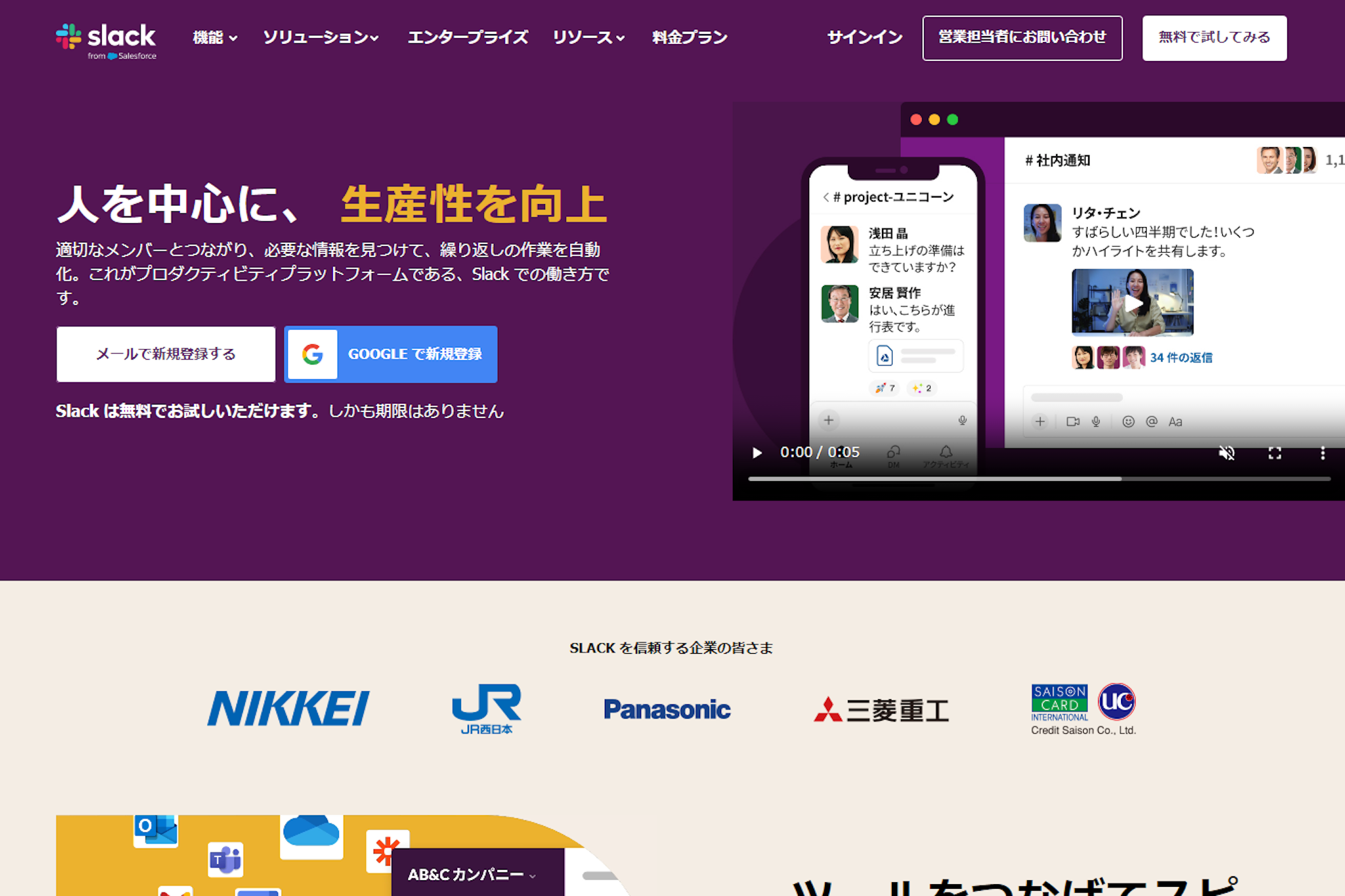 チーム間のコミュニケーションとコラボレーションを目的としたビジネス向けのチャットツールです。リアルタイムメッセージング、ファイル共有、チームやプロジェクトごとにチャンネルの作成が可能などの機能を提供し、チームのコミュニケーションを効率化します。