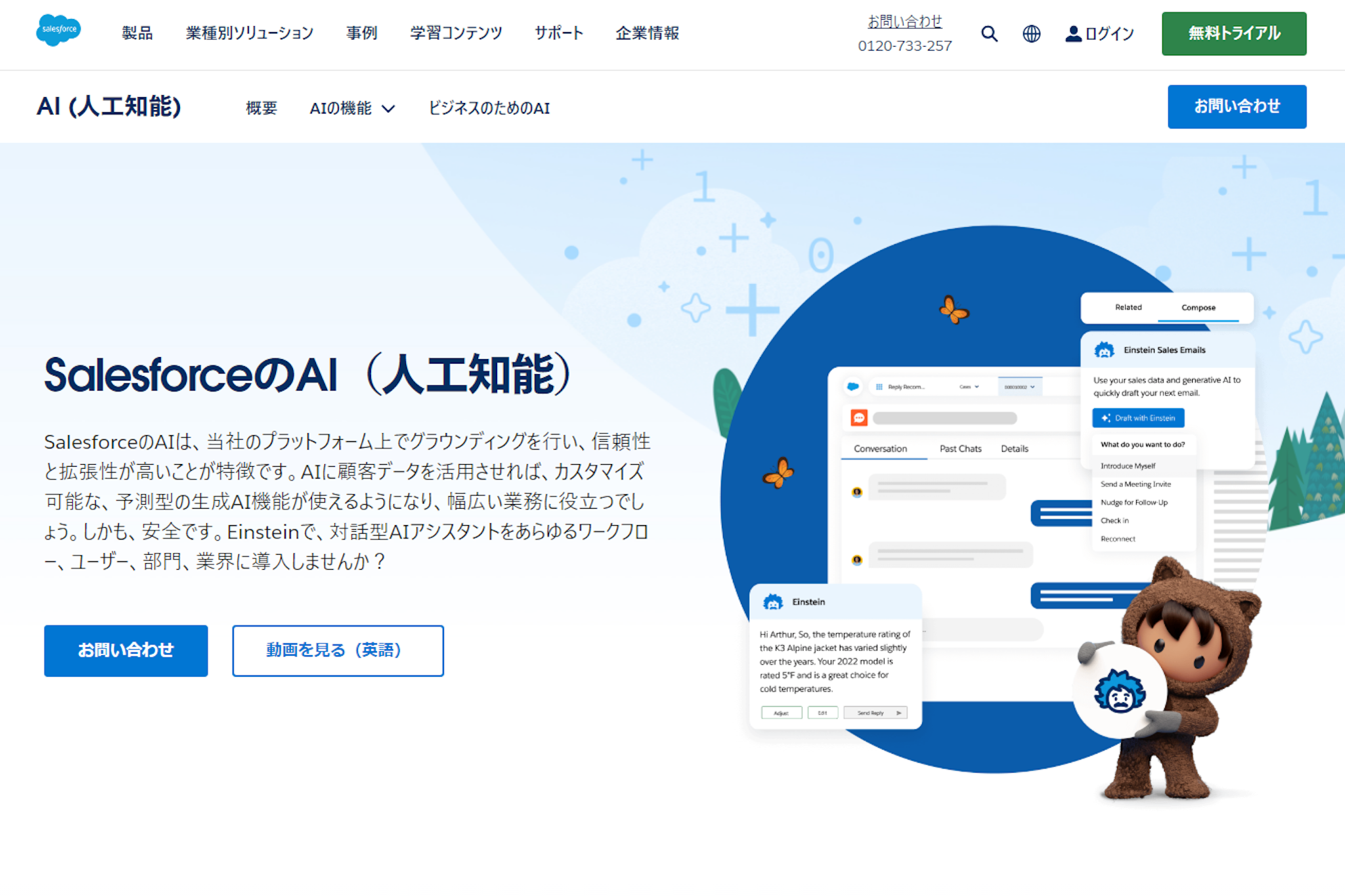 Salesforce社が提供するAI機能の統合プラットフォームです。データのパターンや傾向を自動検出してからの予測分析、タスクやプロセスの自動化、顧客の行動や嗜好に基づいたパーソナライゼーションが可能です。