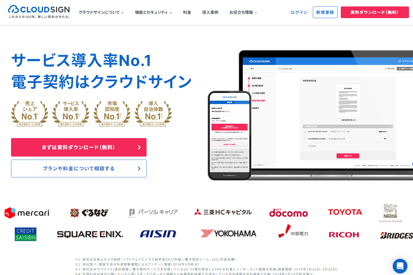 電子契約や電子署名を提供するサービスです。簡単な操作性と高いセキュリティを備え、多くの企業に利用されています。ユーザーフレンドリーで直感的な操作で文書の作成・送信・署名を行え、スマートホンやタブレットからでも契約の作成や署名が可能です。