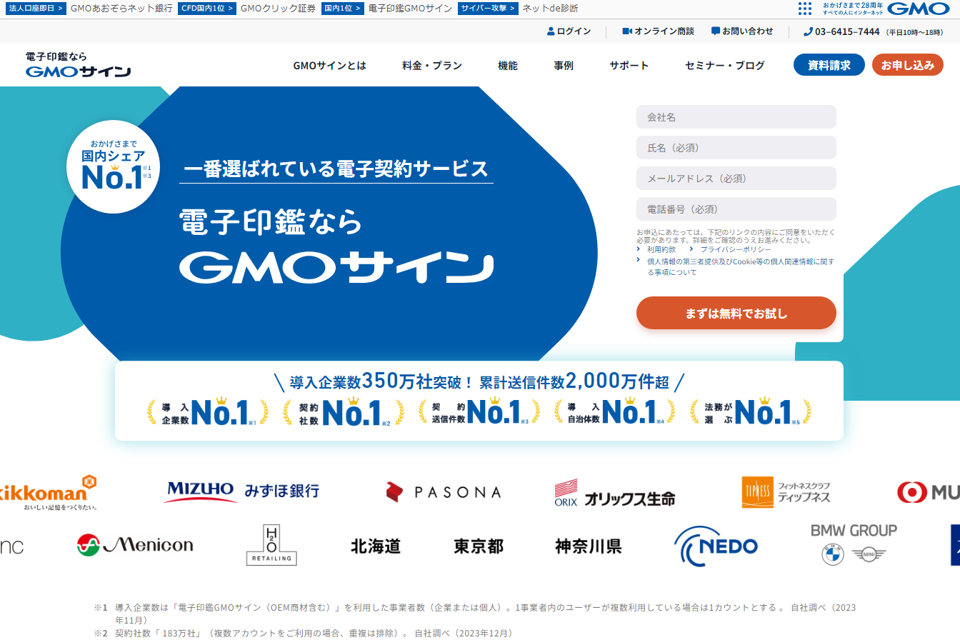 GMOサイン株式会社が提供する電子契約プラットフォームです。手軽に電子署名を導入し、ビジネスプロセスを効率化します。日本のビジネスで特徴的な電子印鑑を使用して契約書や文書に署名することができます。