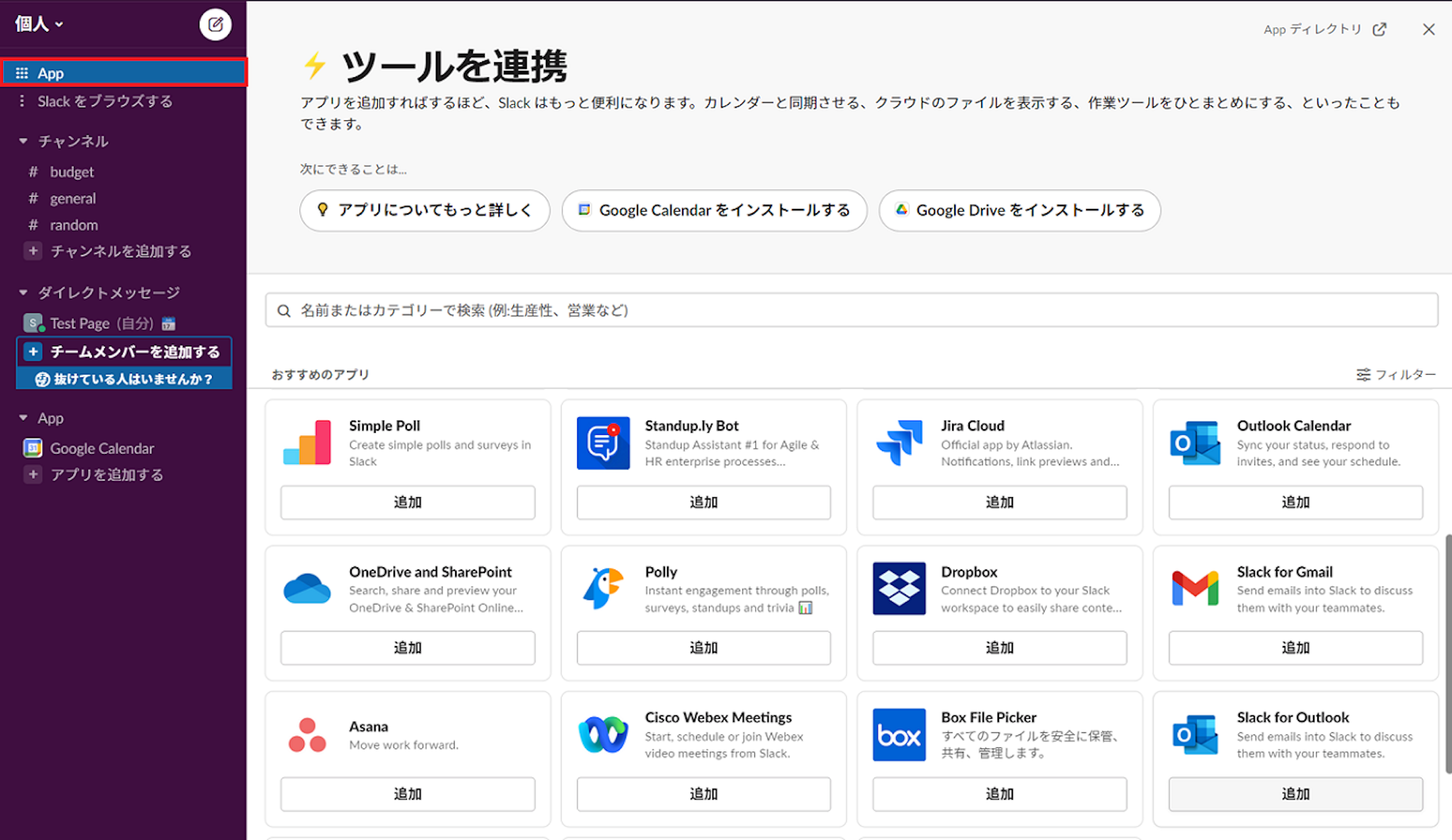 インストール方法はPollyと同じで、Slackのアプリ画面を通じて行います。