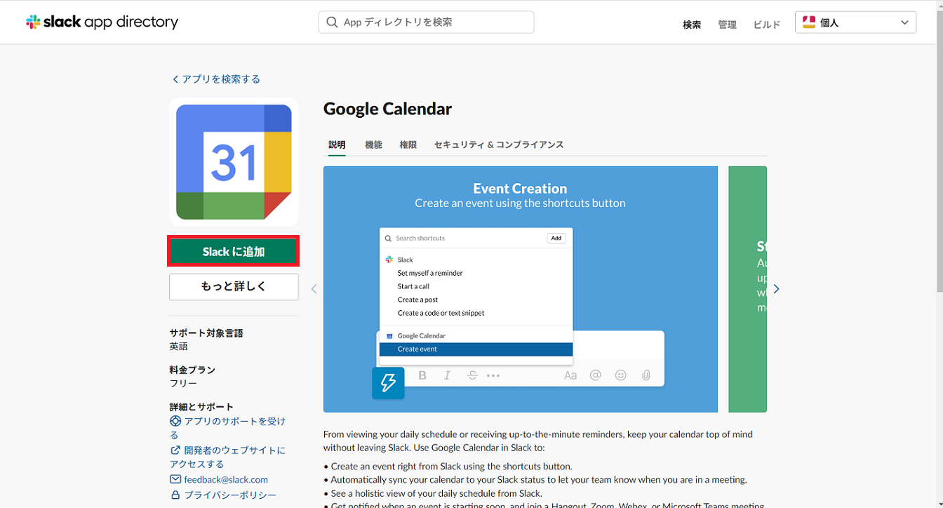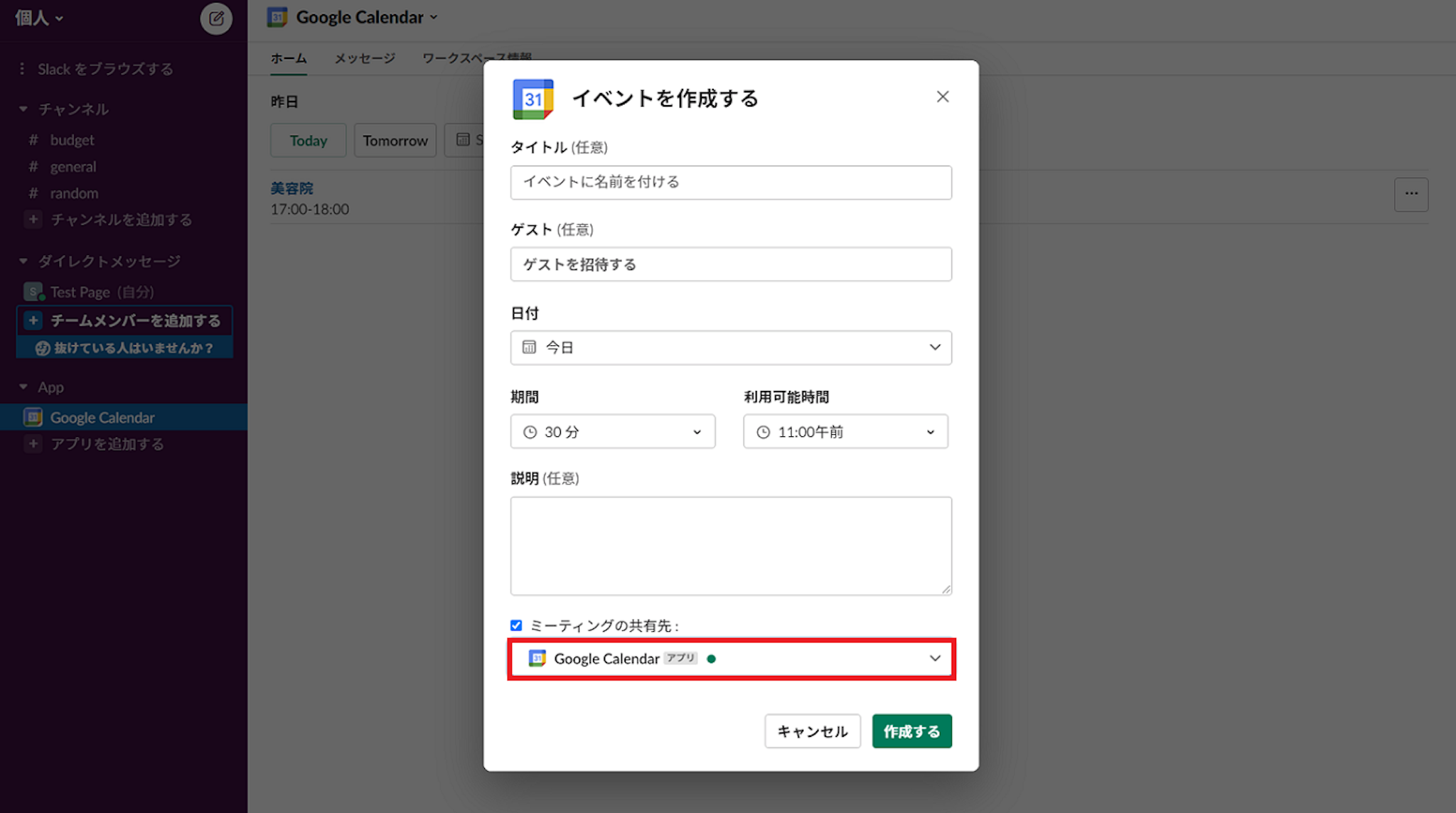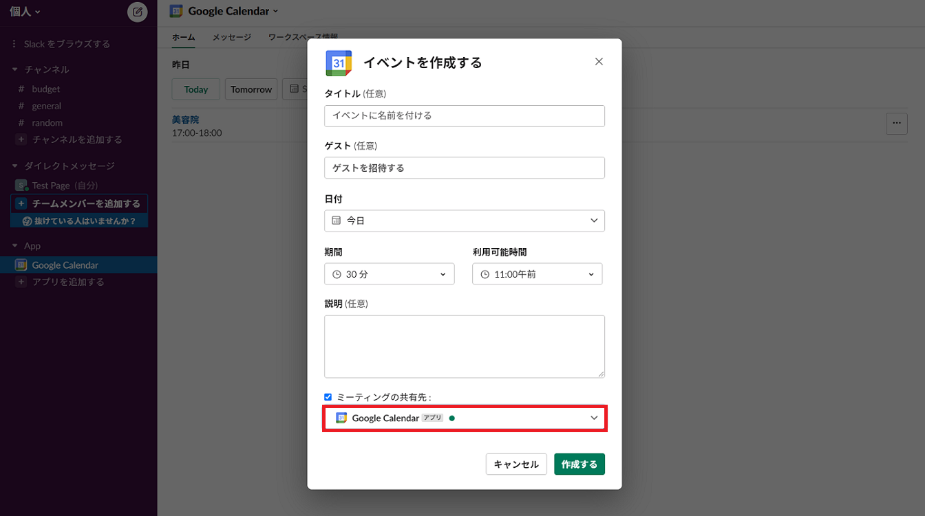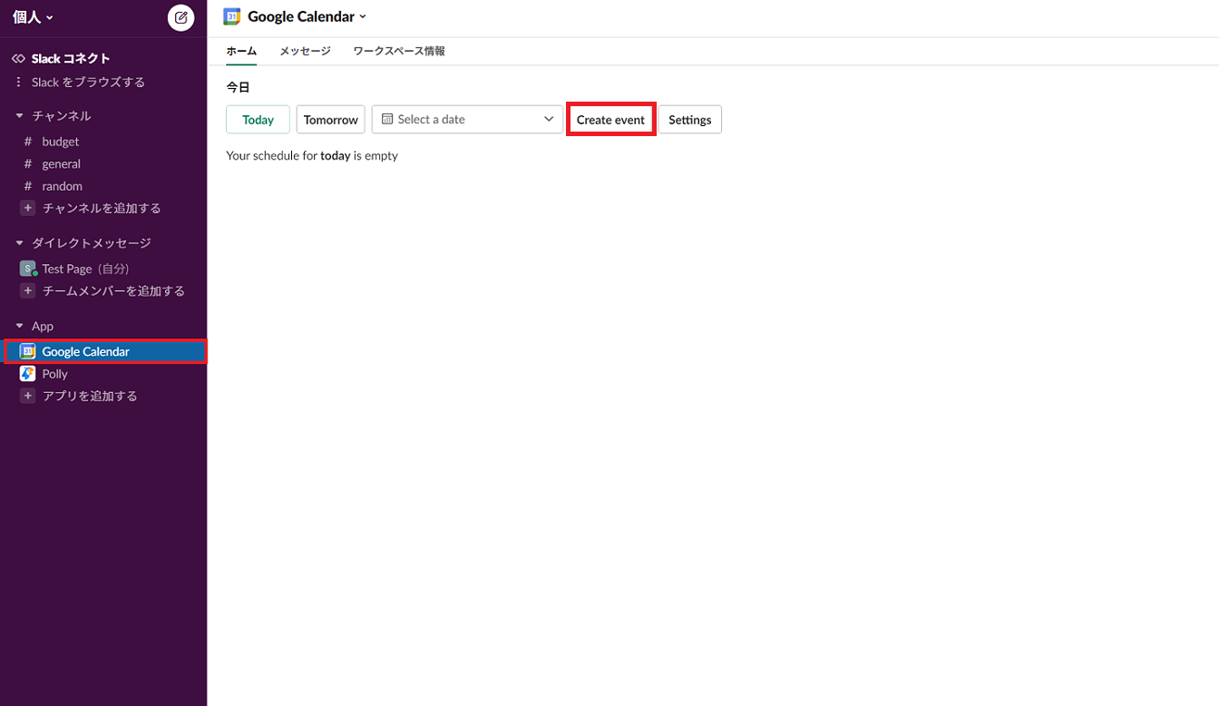アプリのインストールが完了すると、Slack上にGoogleカレンダーの項目ができます。