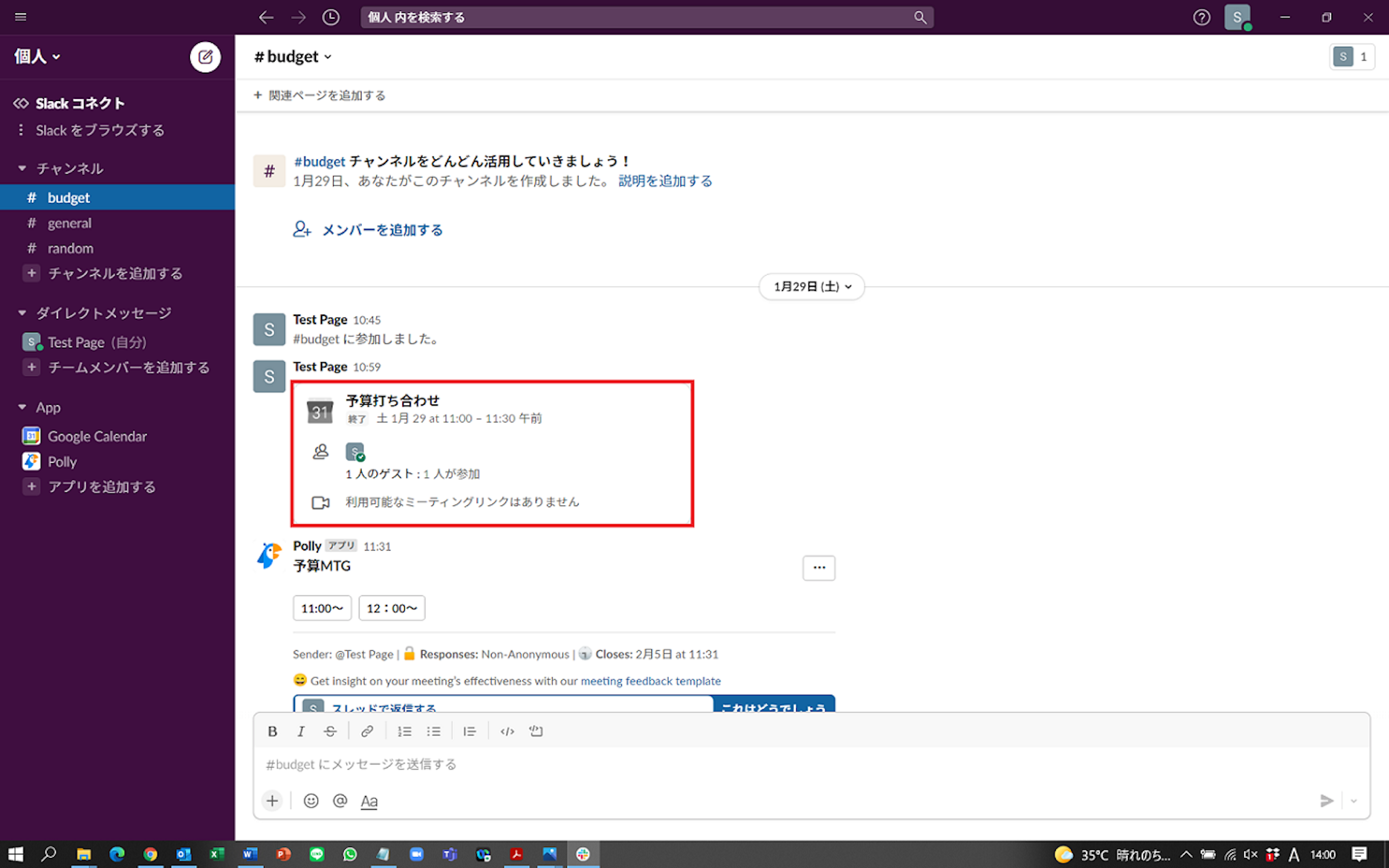 すると、Budgetチームのチャット上に、Googleカレンダーで設定した打ち合わせの予定が、表示されます。