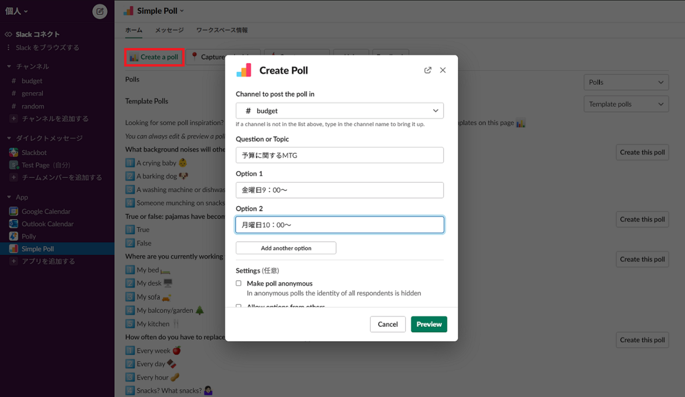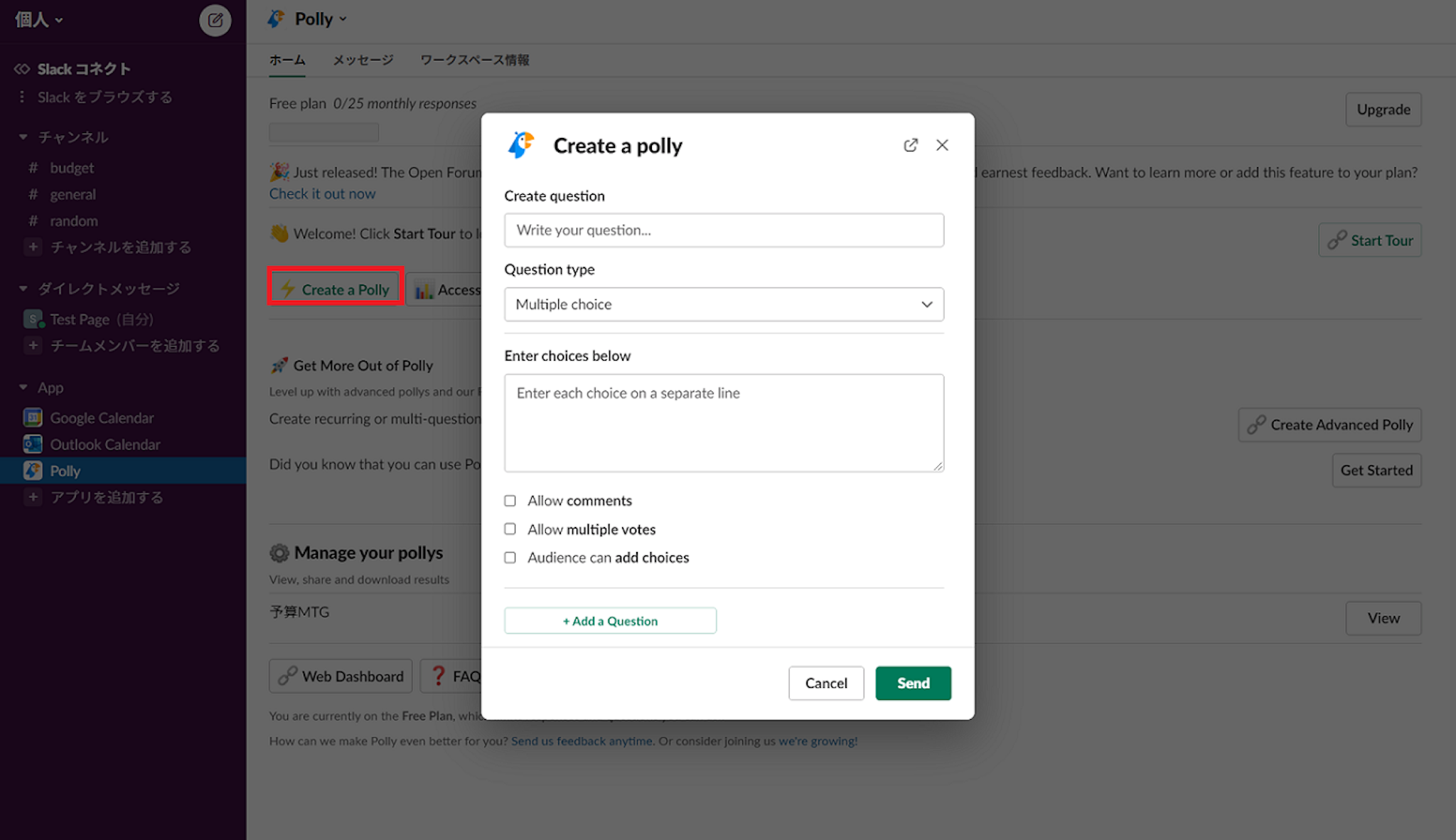 「Create a Polly」というボタンをクリックするとアンケート作成が画面でてきて、簡単にアンケートを作れます。
