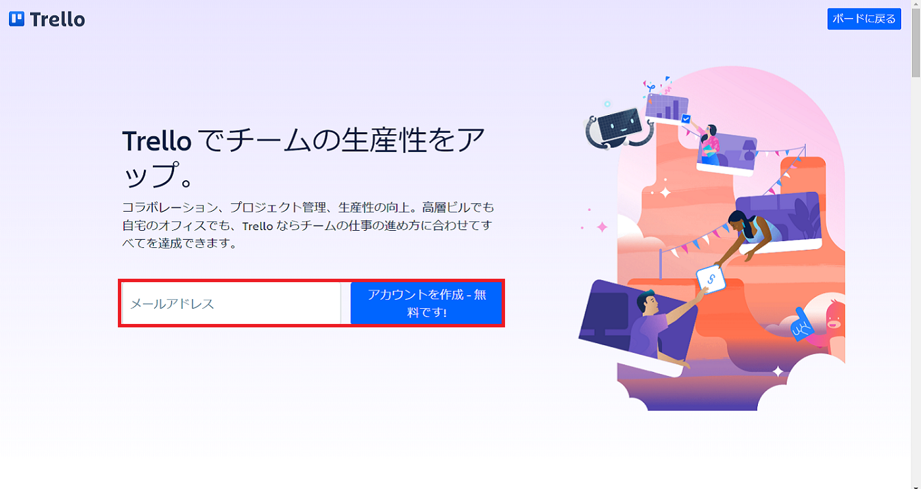 Slackに連携させる前に、まずはTrelloでのアカウント解説が必要です。登録しましょう。