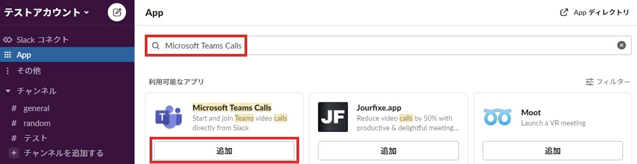 Slackのワークスペースに戻ると、「App」の項目のところに「Microsoft Teams Calls」があることが確認できます。