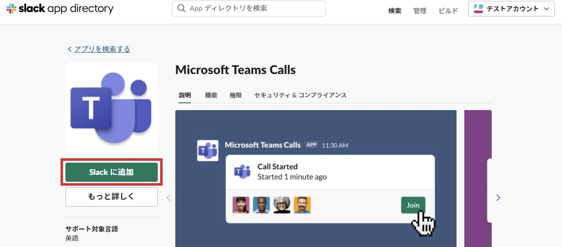 「Microsoft Teams Calls」のページであることを確認し、「Slackに追加」をクリックしてください。