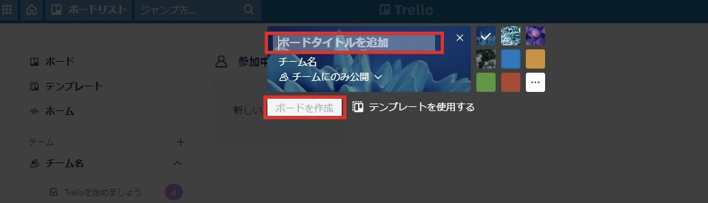 「ボードタイトルを追加」という項目に任意のボードタイトル名を入力し、「ボードを作成」をクリックします。