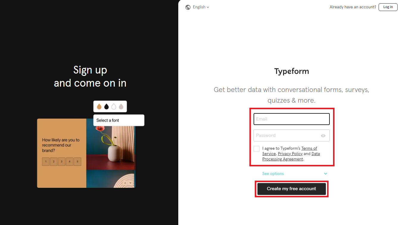 「I agree to Typeform’s Terms of Service, Privacy Policy and Data Processing Agreement.」(サービス利用規約、プライバシー ポリシー、およびデータ処理契約に同意する)をチェックしてアカウントを作成します。
