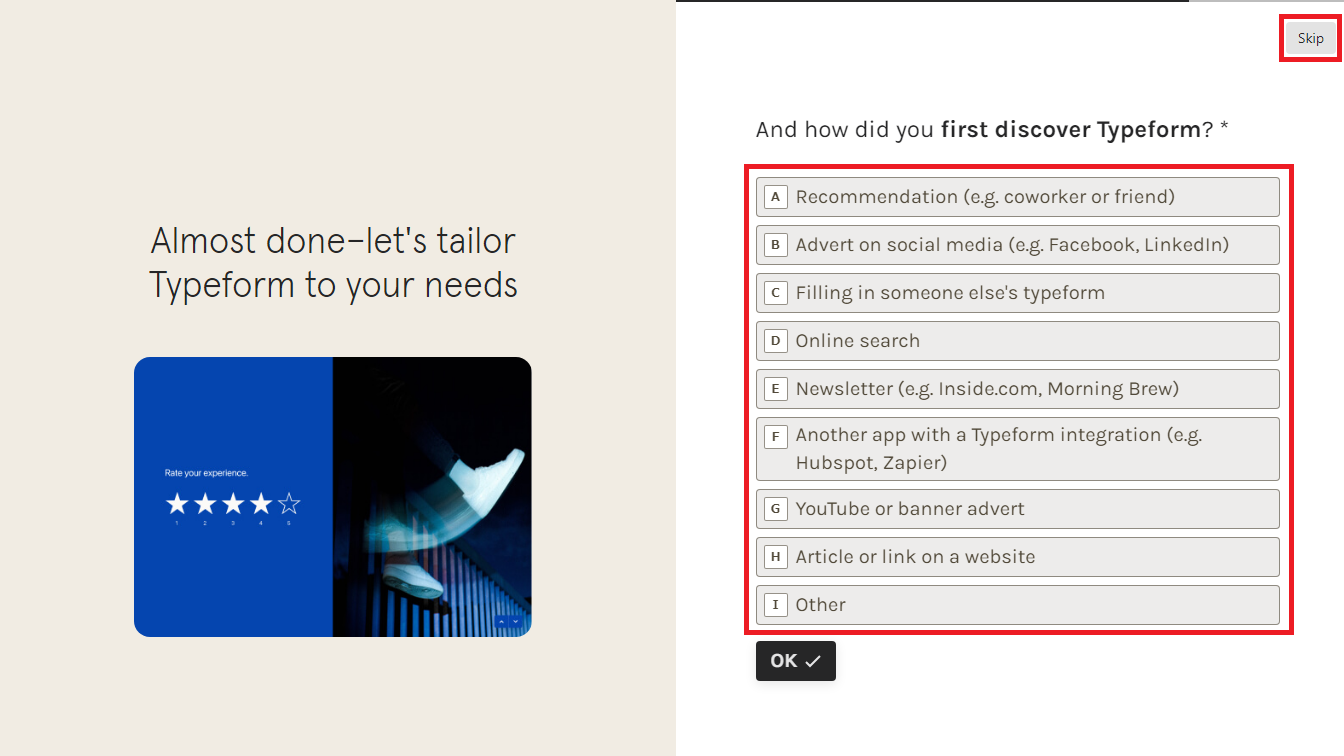 Typeform を最初に知った経緯を回答します。右上の「Skip」を押してスキップも可能です。